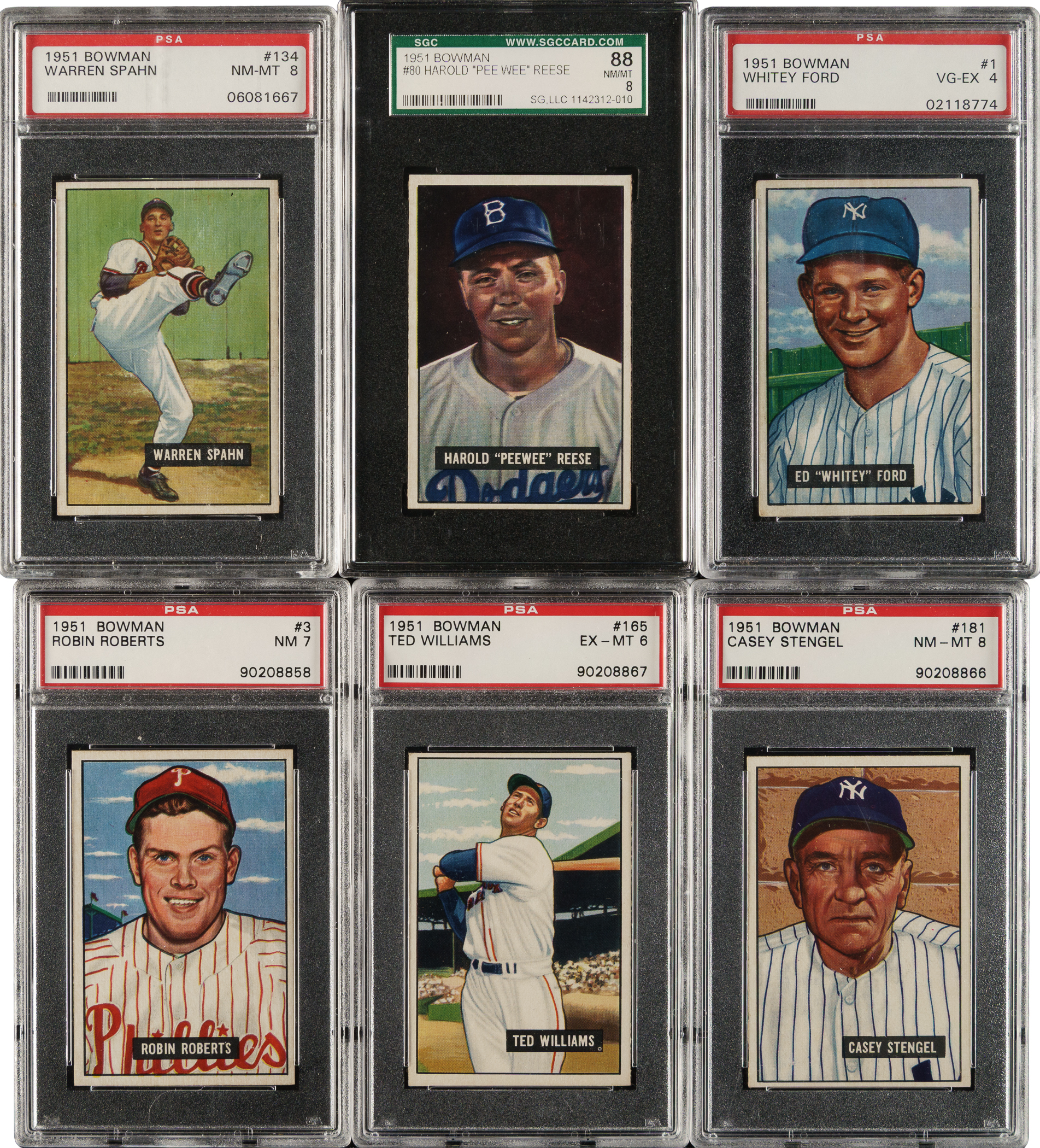 Outstanding mid- to high-grade near-complete set consisting of 321 (of 324) different 1951 Bowman baseball cards, highlighted by many Hall of Famers and stars including Ted Williams and the rookie cards of Whitey Ford, Nellie Fox, and Monte Irvin. Missing only #30 Feller, 253 Mantle, and 305 Mays for completion. Includes three duplicates (#72, 77, and 250). Condition is 24% Nr/Mt to Nr/Mt-Mt (including one Mint), 53% Ex to Ex-Mt, and 23% Vg to Vg-Ex (including a couple lesser and a couple with a slight trim). Twenty-seven cards have been professionally graded and encapsulated by PSA (one by SGC). Keys: #1 Ford RC (VG-EX 4), 2 Berra (Vg), 3 Roberts (NM 7), 7 Hodges (Vg+), 10 Schoendienst (Ex-Mt+), 26 Rizzuto (Vg+), 31 Campanella (Ex-Mt), 32 Snider (measures a bit small, otherwise Ex), 46 Kell (Vg-Ex+), 50 Mize (NM 7), 53 Lemon (NM 7), 58 Slaughter (Vg-Ex+), 78 Wynn (Ex), 80 Reese (SGC NM/MT 88), 134 Spahn (NM-MT 8), 143 Kluszewski (Ex), 151 Doby (Ex-Mt), 165 Williams (EX-MT 6), 181 Stengel (NM-MT 8), 186 Ashburn (NM 7), 198 Irvin RC (85/15 L/R, otherwise Nr/Mt+), 232 Fox RC (NM-MT 8), 233 Durocher (NM-MT 8), 260 Erskine RC (Gd+), 282 Frisch (Ex), 290 Dickey (Ex), 295 Lopez (Vg-Ex), 306 Piersall RC (Ex), 323 Adcock RC (Ex), and 324 Pramesa RC (Vg+). Sixteen additional PSA-graded cards: MINT 9 (1 card): #124. NM-MT 8 (13 cards): #117, 130, 139, 140, 141, 153, 157, 169, 175, 176, 177, 247, and 302. NM 7 (1 card): #122. EX-MT 6 (1 card): #83. This is an extremely attractive near-complete set of this classic early 1950s Bowman issue, which provides a tremendous foundation for the assembly of a superb mid- to high-grade complete set. The equivalent SMR value for just the 27 graded cards is $6,505. Total: 324 cards (near set of 321 plus three duplicates). The size/weight of this item requires that there will be an additional shipping charge for this lot.
