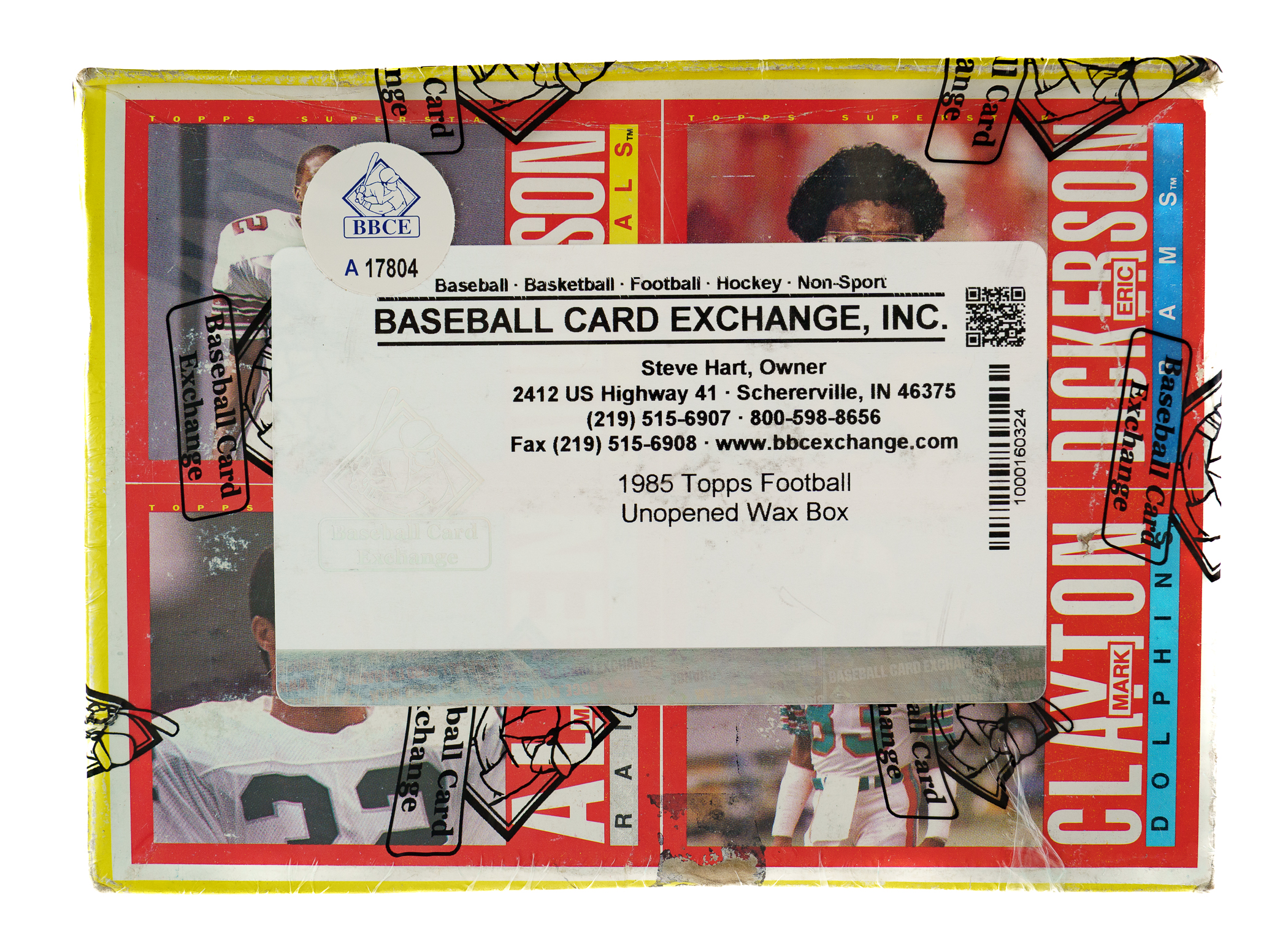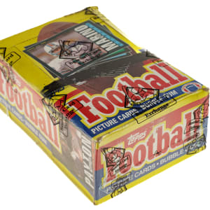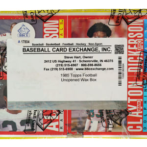 Complete, original unopened wax box of 1985 Topps football. The box houses 36 packs with each pack containing 15 cards for a total of 540 cards. This set features rookie cards of Hall of Famers Richard Dent, Warren Moon, and Mike Munchak, as well as key cards of John Elway, Dan Marino, Joe Montana, and Walter Payton. This box comes shrink-wrapped by Baseball Card Exchange (owned by Steve Hart, the foremost expert on unopened material). The store display box shows moderate shelf wear and a black close-out marking written on the lid.