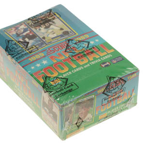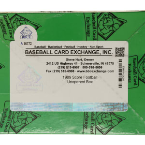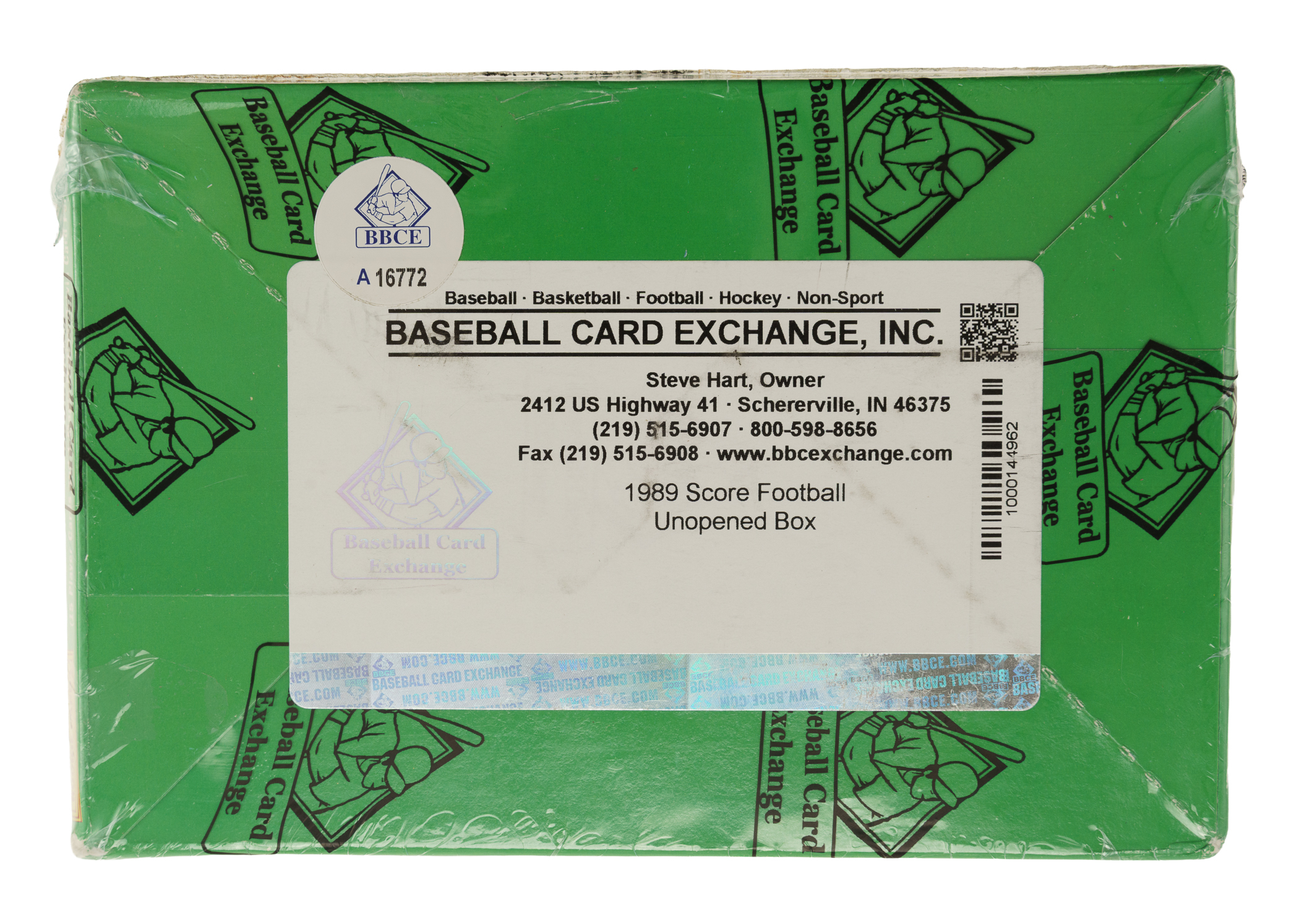 Complete, original unopened wax box of the 1989 Score football series housing 36 packs. This set is highlighted by the rookie cards of Hall of Famers Barry Sanders, Troy Aikman, Derrick Thomas, Cris Carter, Tim Brown, Michael Irvin, Thurman Thomas, and Deion Sanders. The store display box is bright and bold and has light shelf wear. The box comes shrink-wrapped by Baseball Card Exchange (owned by Steve Hart, the foremost expert on unopened material).