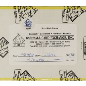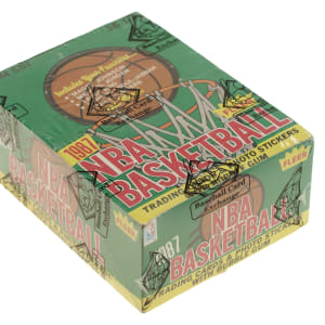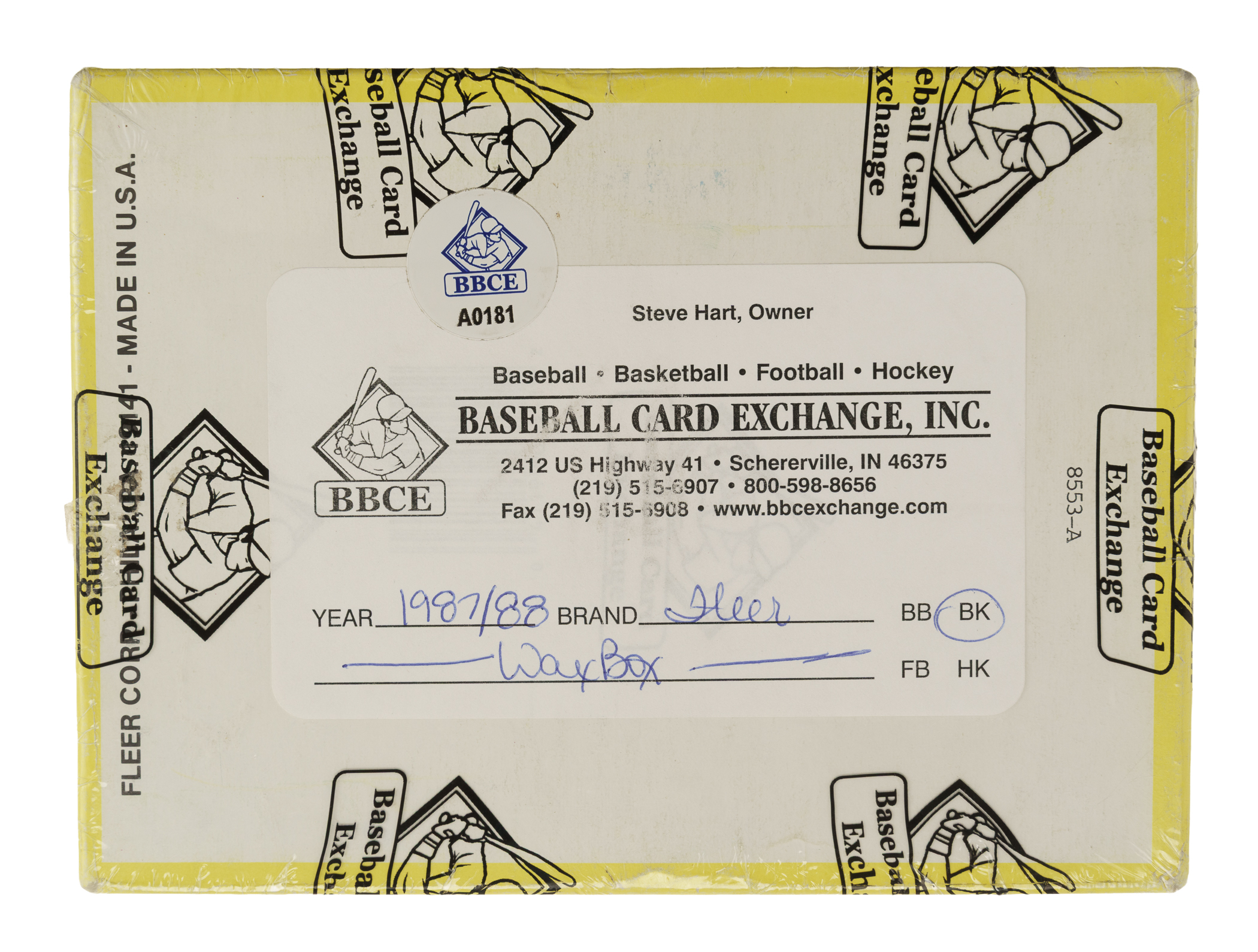 Complete, original unopened wax box of 1987-1988 Fleer basketball. The box comes shrink-wrapped by Baseball Card Exchange (owned by Steve Hart, the foremost expert on unopened material). The box contains 36 wax packs with each pack containing 12 cards and one sticker for a total of 432 cards and 36 stickers. The 1987-1988 Fleer set includes the cards of Hall of Famers Larry Bird, Magic Johnson, Michael Jordan, and Charles Barkley, as well as rookie cards of Brad Daugherty and Detlef Schrempf. The box displays light shelf wear.