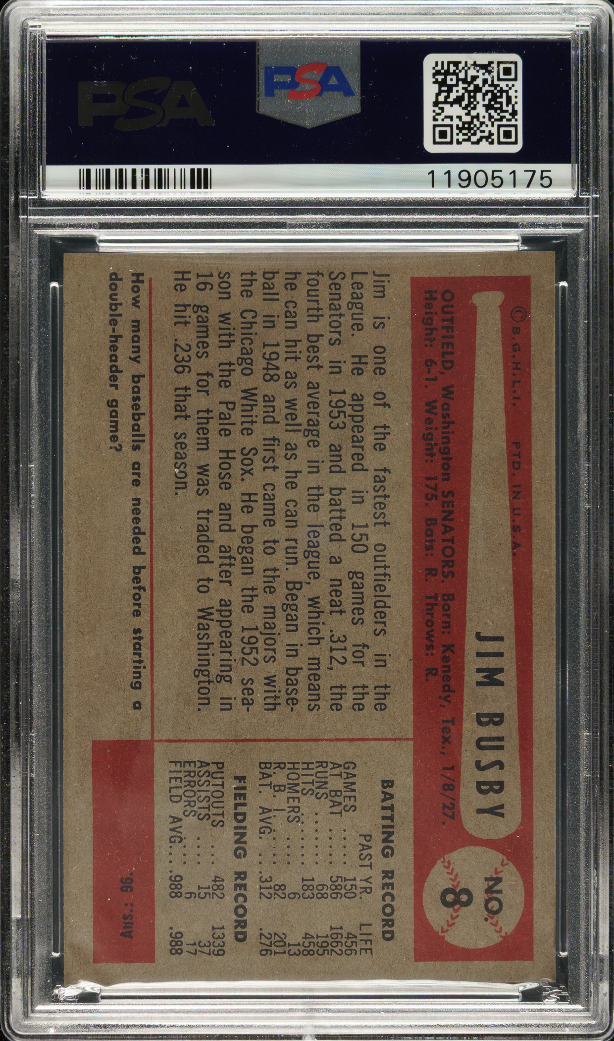 Graded MINT 9 by PSA. Washington Senators. One of only four examples graded at this level with none higher out of 210 cards evaluated by PSA to date!