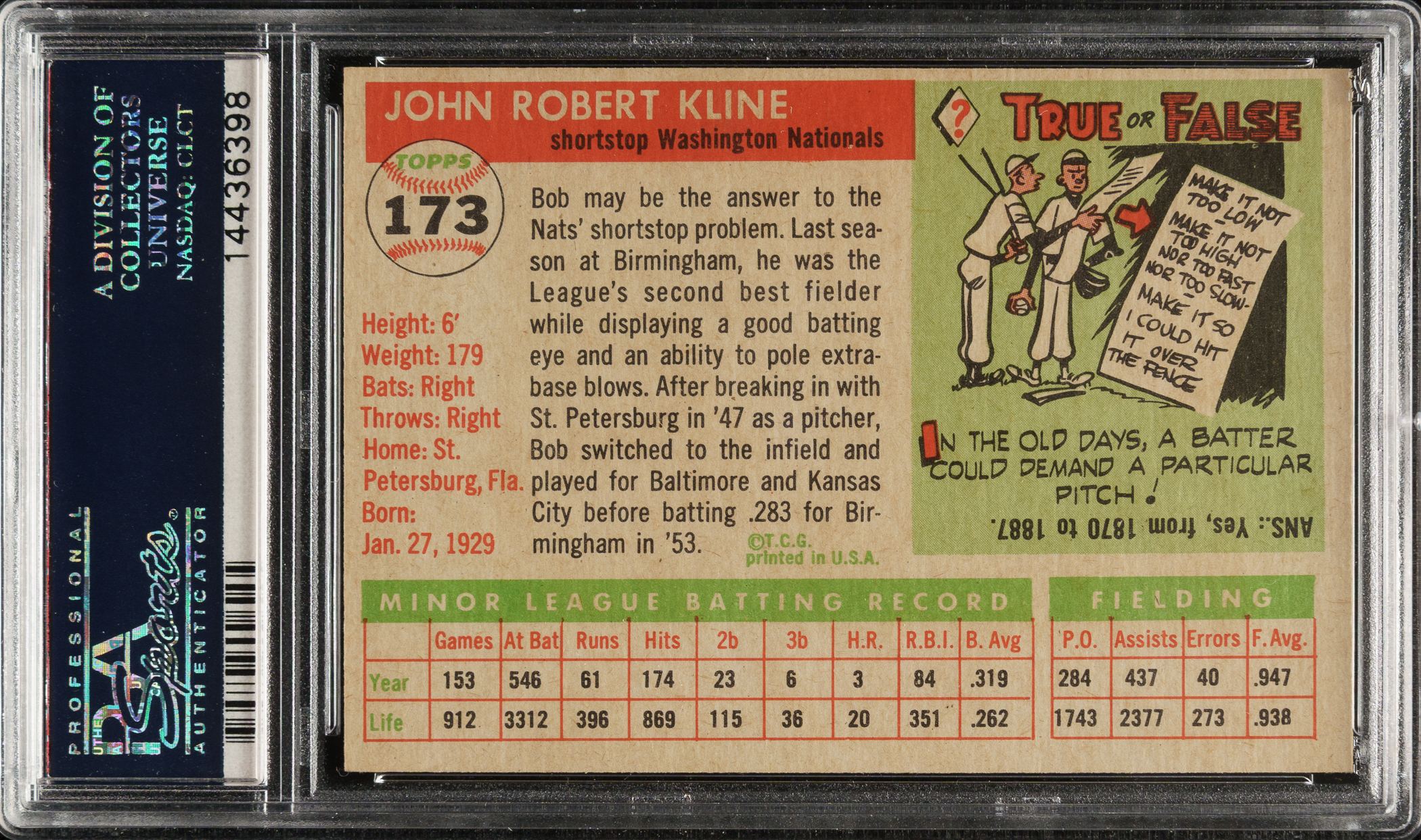 Graded MINT 9 by PSA. Washington Senators. One of only six examples graded at this level with none higher out of 669 cards evaluated by PSA to date!