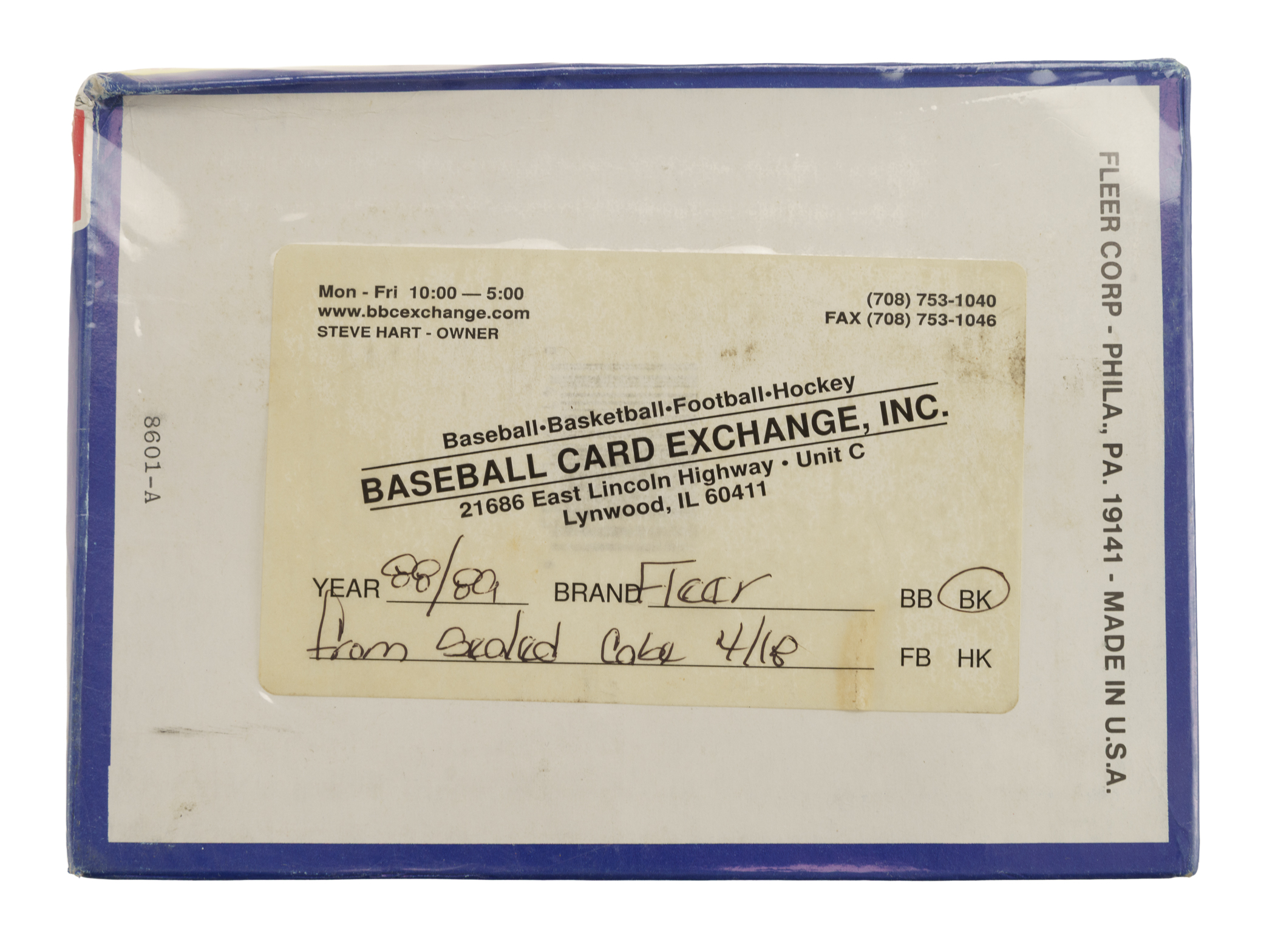 Complete, original unopened wax box from the 1988-1989 Fleer basketball series. The box comes shrink-wrapped by Baseball Card Exchange (owned by Steve Hart, the foremost expert on unopened material) and bears the certified designation as having originated from a sealed case. The box contains 36 wax packs, each containing 12 cards and one sticker for a total of 432 cards and 36 stickers. The 1988-1989 Fleer set includes the rookie cards of Hall of Famers Reggie Miller, Scottie Pippen, Dennis Rodman, and John Stockton, as well as cards of several other Hall of Famers, including Larry Bird, Magic Johnson, Michael Jordan, and Patrick Ewing. The box has light shelf wear.