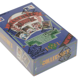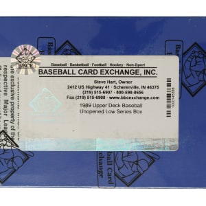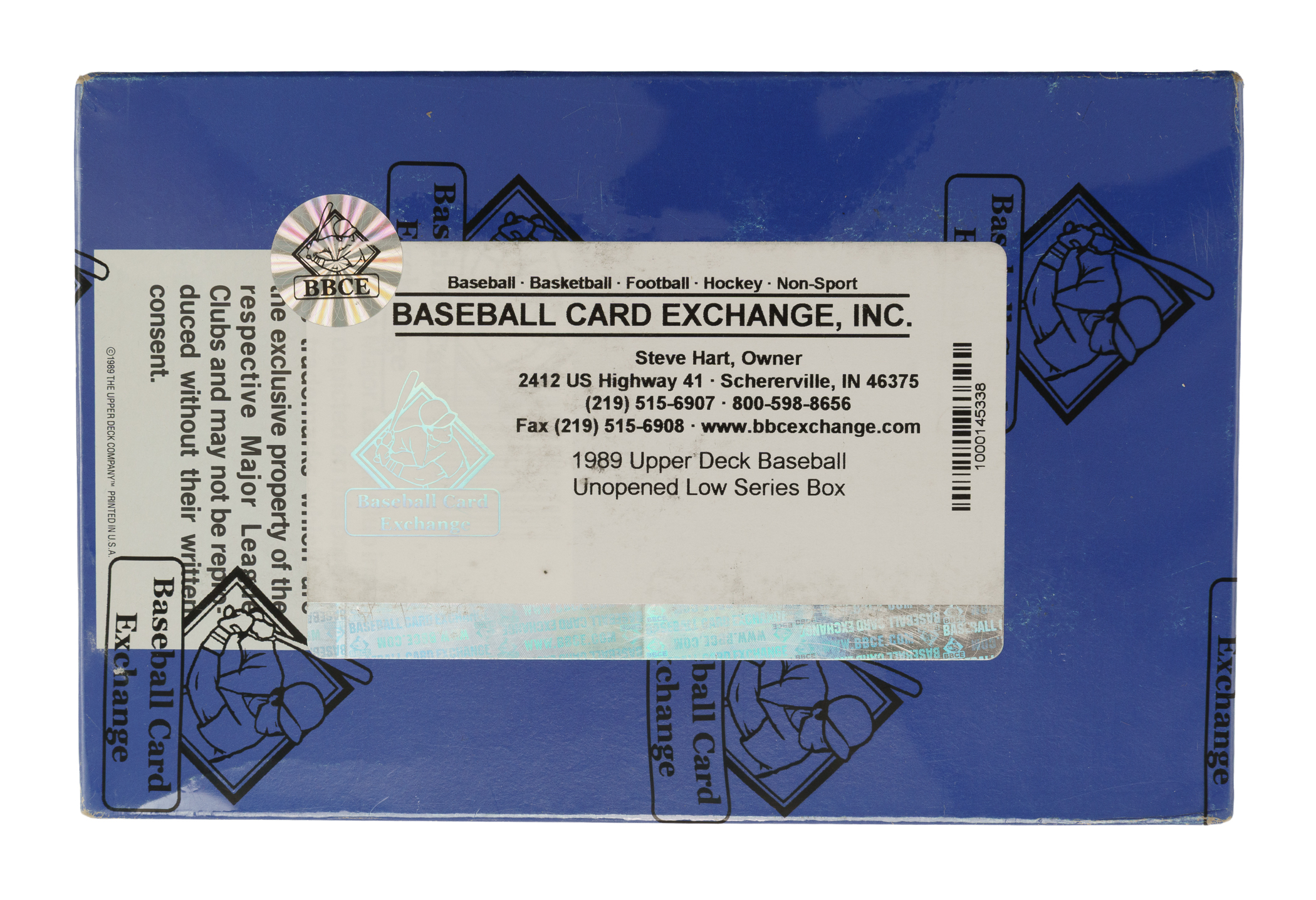 Complete, unopened 1989 Upper Deck baseball low-number series wax box containing 36 packs. The 1989 Upper Deck low-number series includes rookie cards of Hall of Famers Ken Griffey Jr., Randy Johnson, Gary Sheffield, and John Smoltz. The box comes shrink-wrapped by Baseball Card Exchange (owned by Steve Hart, the foremost expert on unopened material).