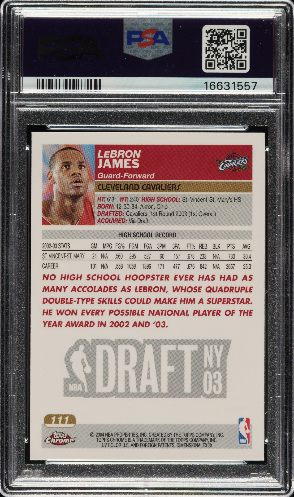 Graded GEM MINT 10 by PSA. Tremendous example of LeBron James' rookie card from the 2003-2004 Topps Chrome basketball-card set. This card is a gem! Brilliant colors, sharp corners, excellent centering, and a flawless surface. Clean reverse. A stunning example of this future Hall of Famer's rookie card in unparalleled high grade!