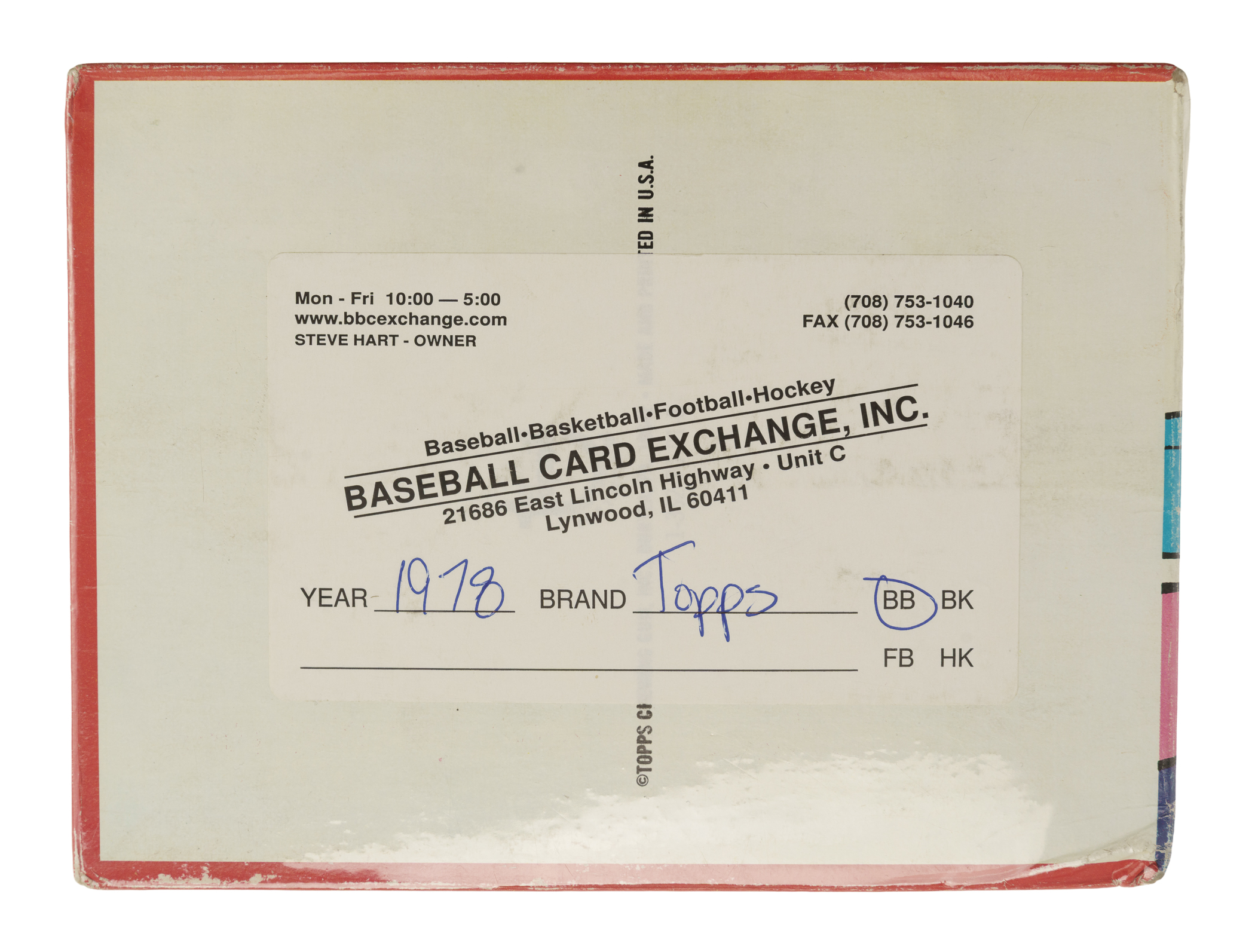 Complete, original unopened wax box of 1978 Topps baseball. The box houses 36 packs with each pack containing 10 cards for a total of 360 cards. The 1978 Topps set includes rookie cards of Eddie Murray and Paul Molitor, as well as cards of many other Hall of Famers, including Nolan Ryan, George Brett, and Robin Yount. This box comes shrink-wrapped by Baseball Card Exchange (owned by Steve Hart, the foremost expert on unopened material). The display box is bright and bold with light-to-moderate shelf wear.