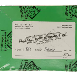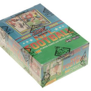 Complete, original unopened wax box of the 1989 Score football series housing 36 packs. This set is highlighted by the rookie cards of Hall of Famers Barry Sanders, Troy Aikman, Derrick Thomas, Cris Carter, Tim Brown, Michael Irvin, Thurman Thomas, and Deion Sanders. The store display box is bright and bold and has light shelf wear. The box comes shrink-wrapped by Baseball Card Exchange (owned by Steve Hart, the foremost expert on unopened material).