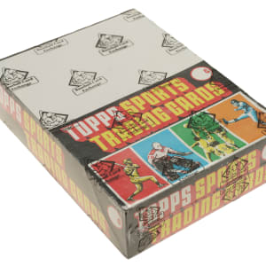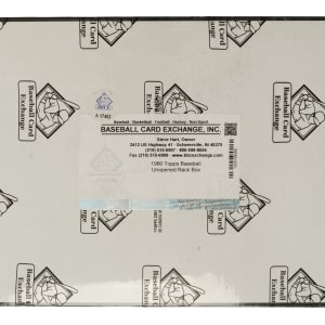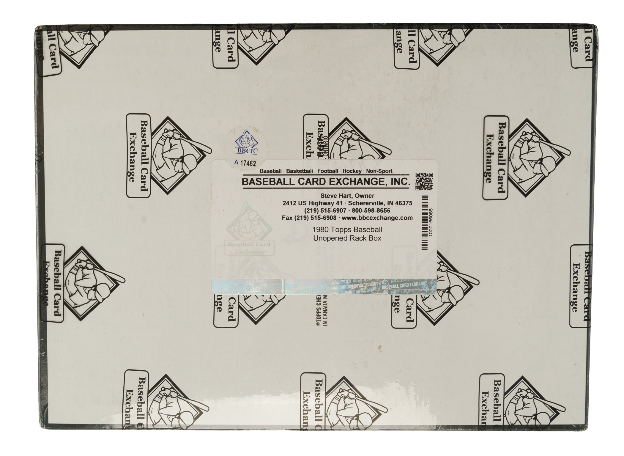 Complete, original unopened rack pack box of 1980 Topps baseball. The box houses 24 packs with each pack containing 42 cards, for a total of 1,008 cards. The 1980 Topps set is highlighted by dozens of Hall of Famers and stars, including Nolan Ryan, George Brett, and the rookie card of Rickey Henderson. The store display box is bright and bold, with light shelf wear. The box comes shrink-wrapped by Baseball Card Exchange (owned by Steve Hart, the foremost expert on unopened material). An outstanding unopened box from this popular 1980s baseball set!