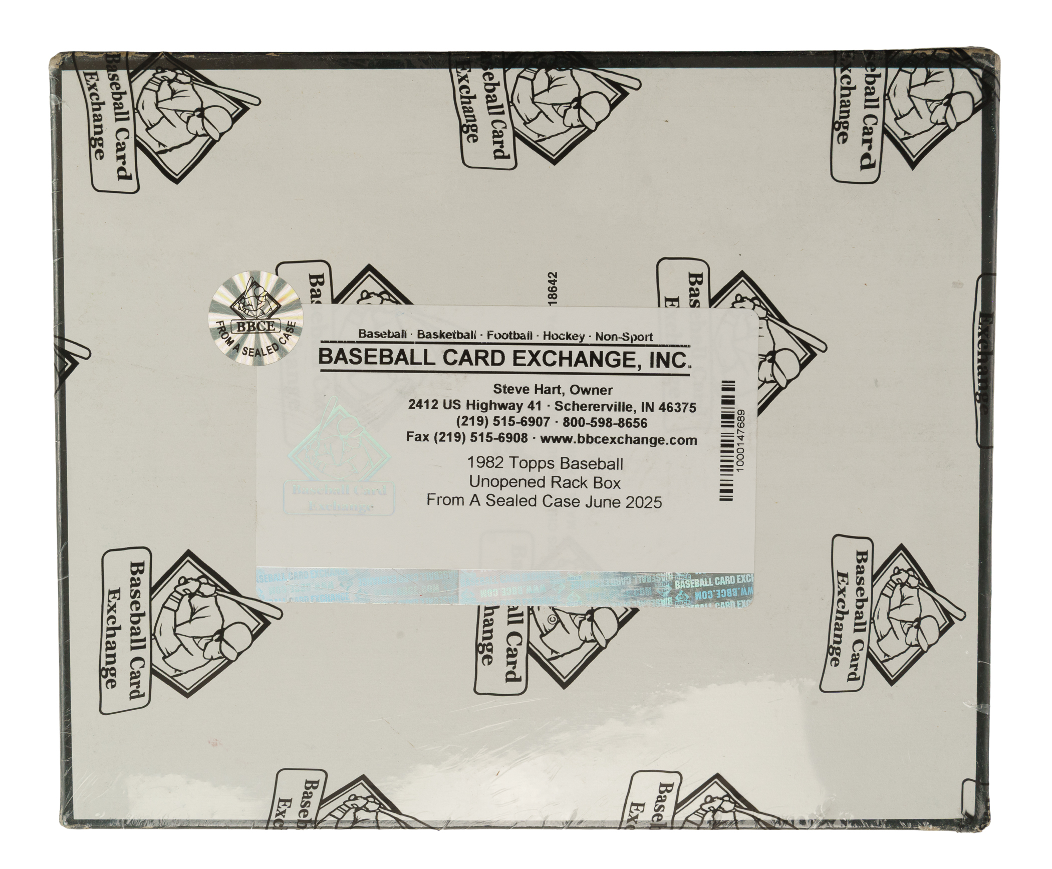 Complete, original unopened rack pack box of 1982 Topps baseball. The box houses 24 packs with each pack containing 51 cards, for a total of 1,224 cards. The 1982 Topps set includes the rookie cards of Cal Ripken and Lee Smith. The store display box is bright and bold and has a case-fresh appearance. The box comes shrink-wrapped by Baseball Card Exchange (owned by Steve Hart, the foremost expert on unopened material) and bears a certified designation as having originated from a sealed case.