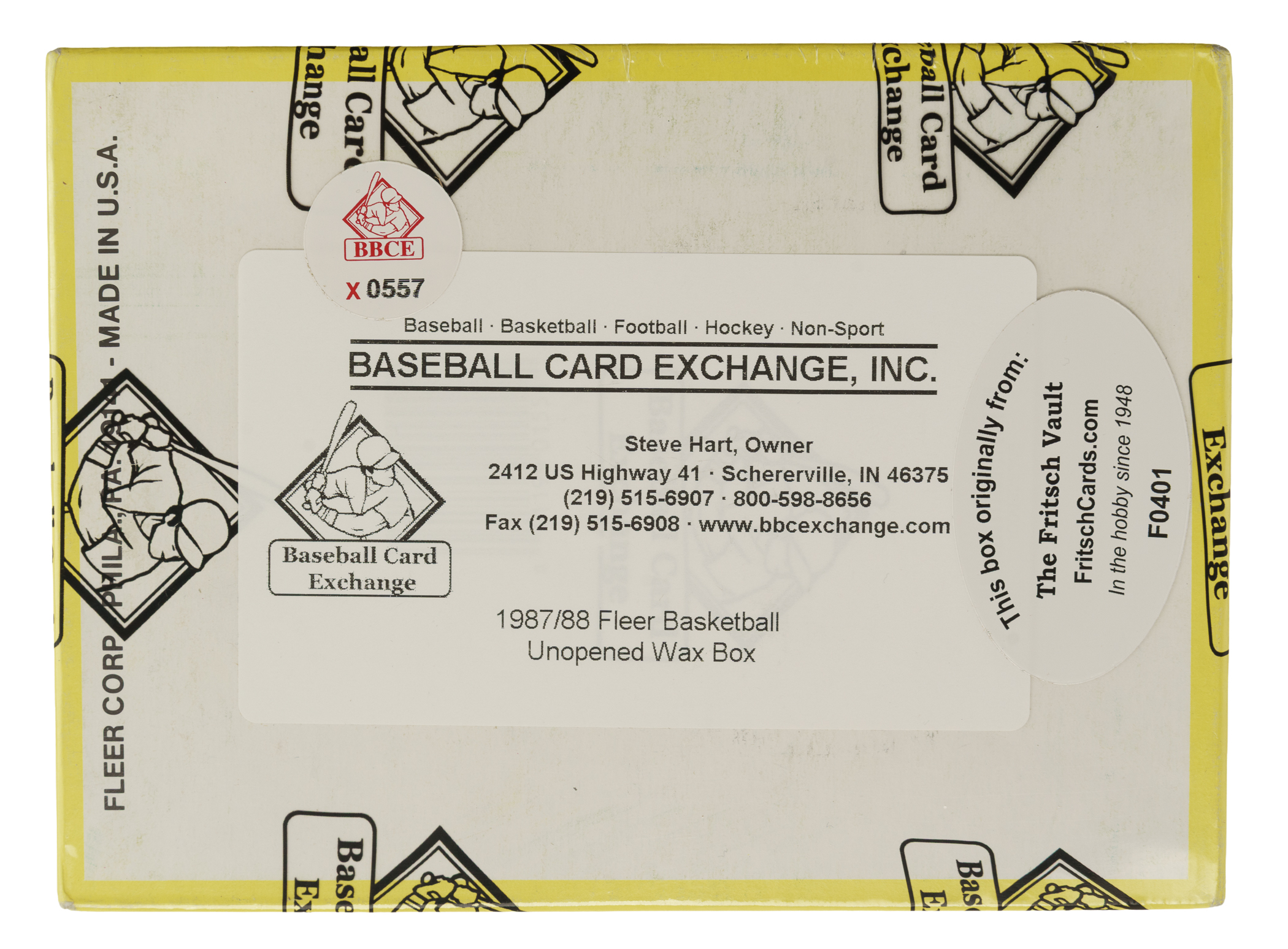 Complete, original unopened wax box of 1987-1988 Fleer basketball. The box comes shrink-wrapped by Baseball Card Exchange (owned by Steve Hart, the foremost expert on unopened material) and originates directly from the legendary Larry Fritsch estate. The box contains 36 wax packs with each pack containing 12 cards and one sticker for a total of 432 cards and 36 stickers. The 1987-1988 Fleer set includes the cards of Hall of Famers Larry Bird, Magic Johnson, Michael Jordan, and Charles Barkley, as well as rookie cards of Brad Daugherty and Detlef Schrempf. The box exhibits minimal shelf wear.