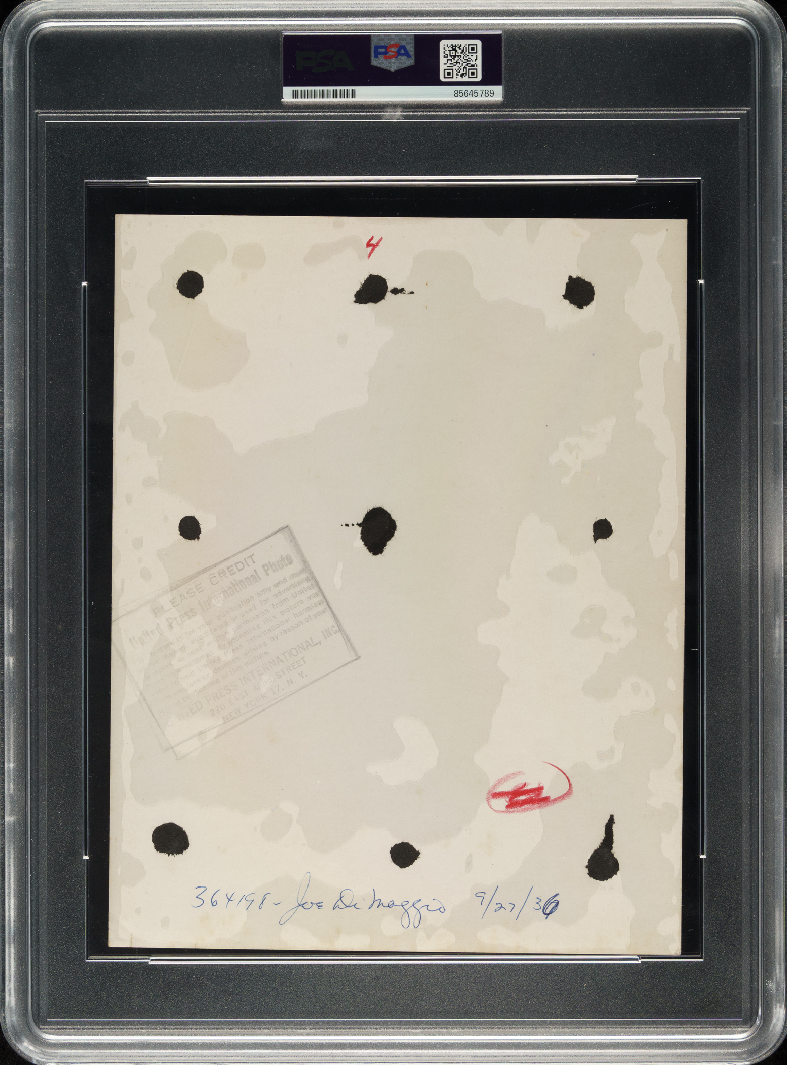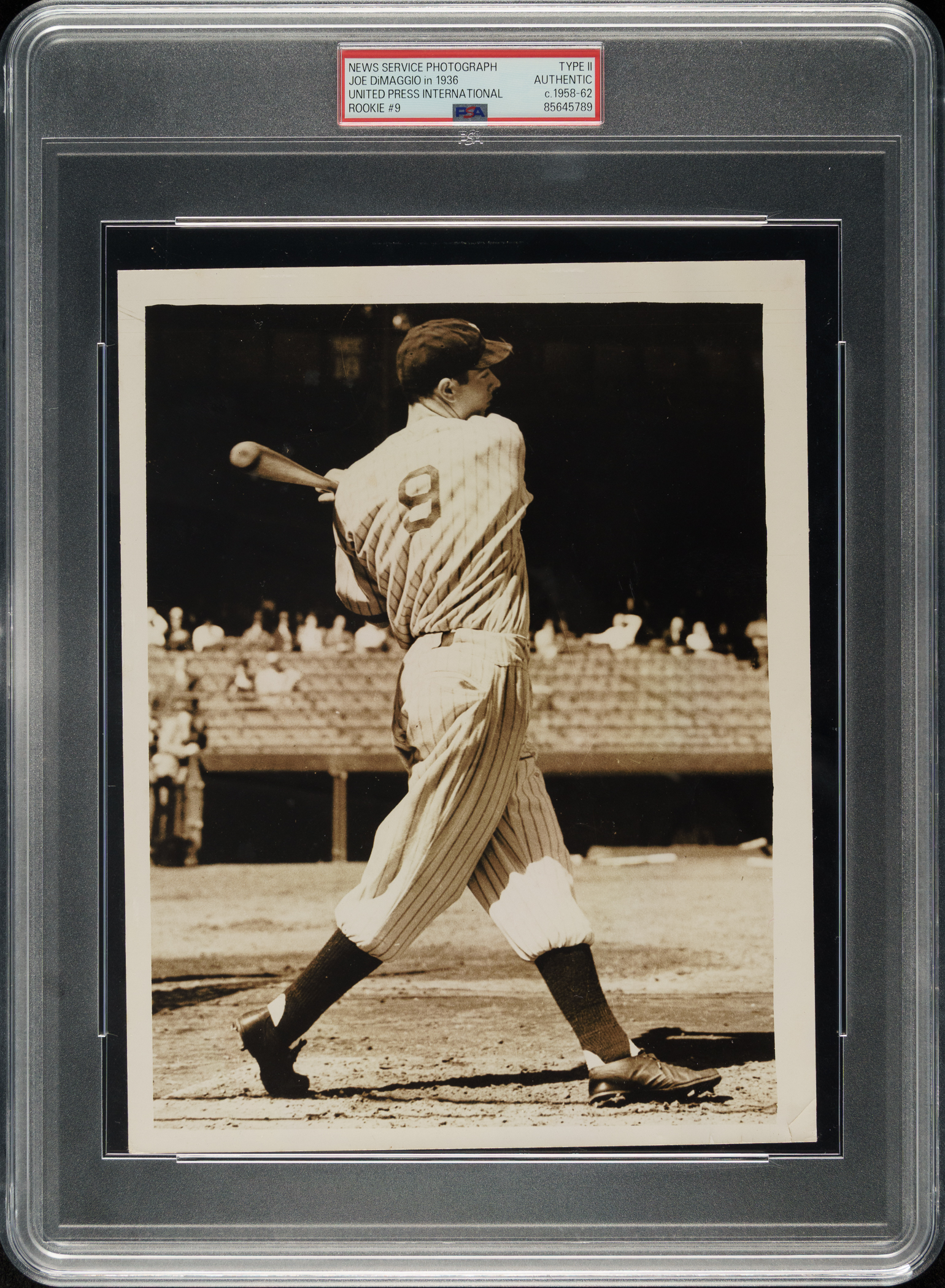 Vintage news photo featuring a rookie-era image of Joe DiMaggio as a member of the New York Yankees in 1936. Encapsulated and certified as an original Type II photo by PSA/DNA. DiMaggio is captured in a swing-through pose, wearing the No. 9 - a number he donned only during his rookie season before switching to his iconic No. 5 in 1937, which he wore the remainder of his career. The reverse features a "United Press International Photo" credit stamp, a few editorial notations, and evidence of album removal. The photo, which has been trimmed to its current dimensions of 7 x 9 inches, is in Very Good condition overall.