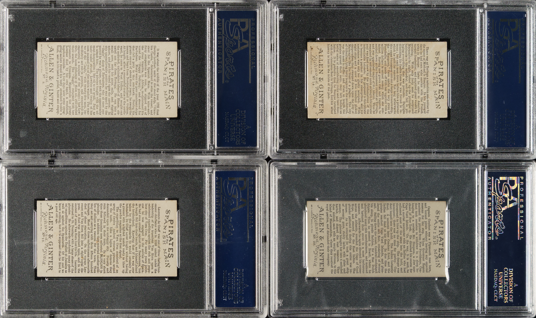 Presented is a collection of four 1888 N19 Allen & Ginter "Pirates of the Spanish Main" trading cards, each professionally graded and encapsulated EX-MT 6 by PSA. This collection consists of the following: #8, 13, 14, and 20. Total: 4 cards.