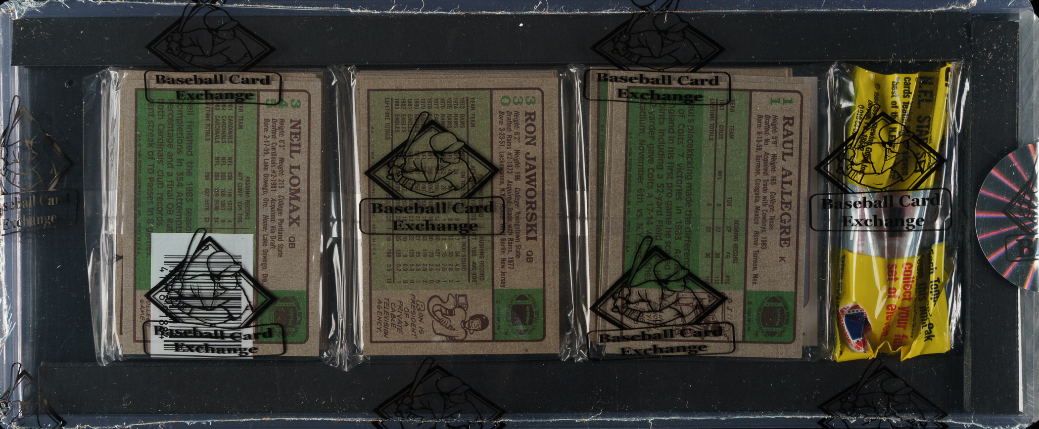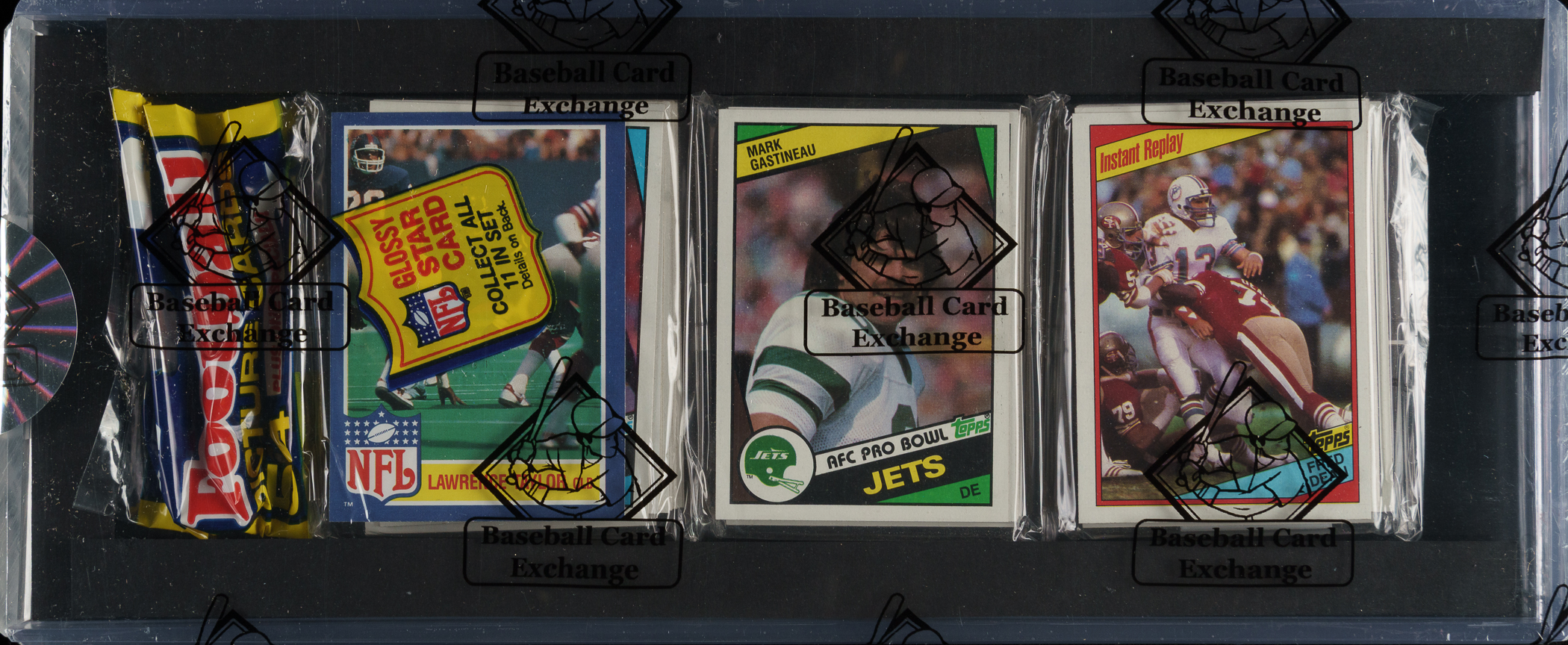 Original unopened rack pack of fifty-four 1984 Topps football cards with Hall of Famer Lawrence Taylor's Glossy NFL Stars insert showing on top. This pack comes shrink-wrapped by Baseball Card Exchange (owned by Steve Hart, the foremost expert on unopened material).