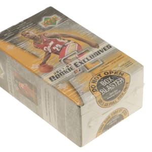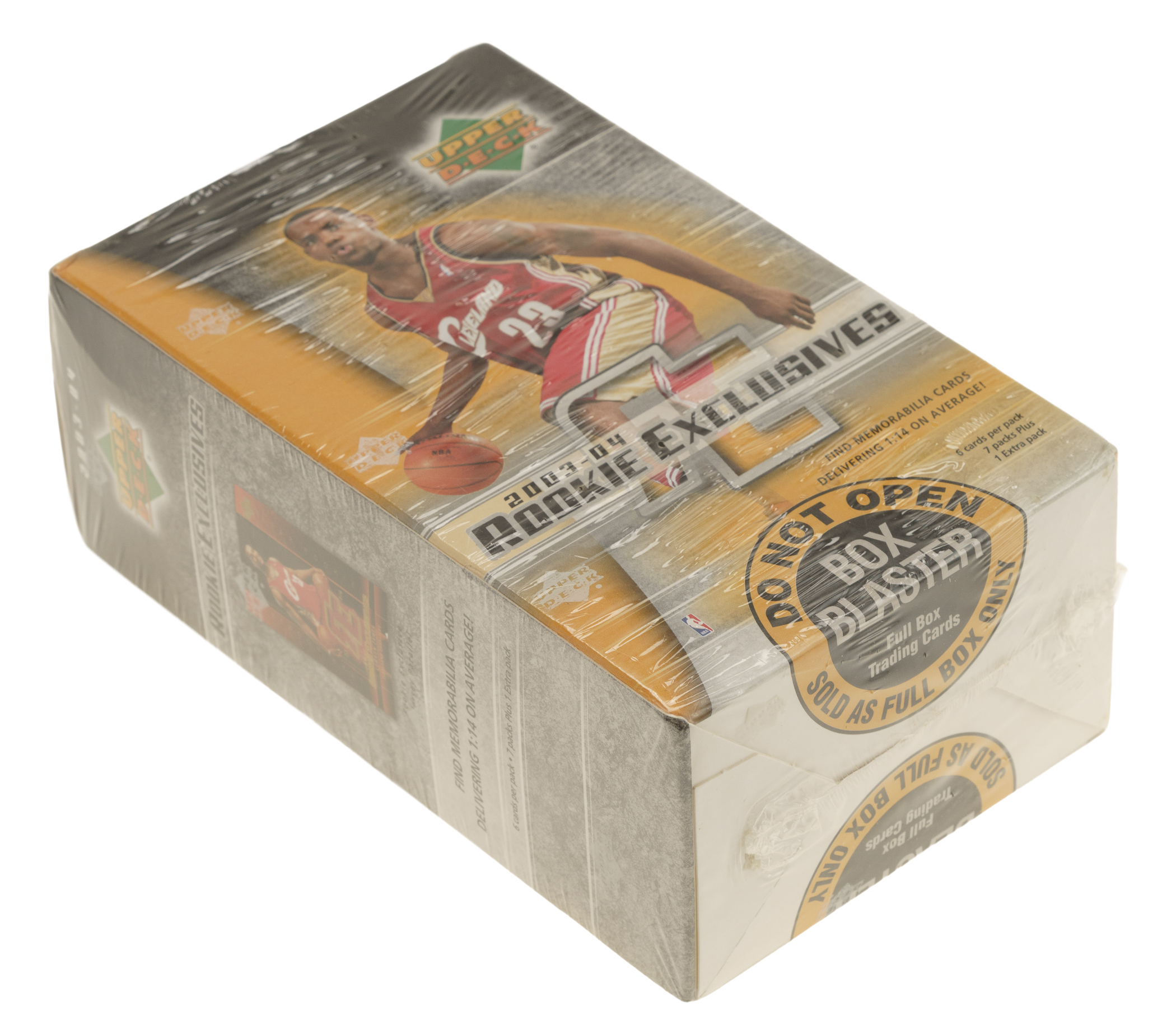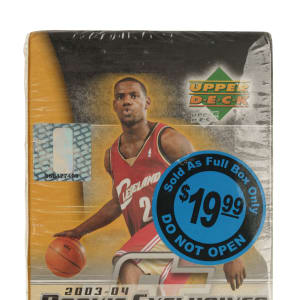 Presented is an unopened 2003-2004 Upper Deck Rookie Exclusives basketball blaster box containing eight packs. The box is wrapped in its original factory cellophane. The key to this set is the rookie card of LeBron James, as well as the rookie cards of Carmelo Anthony, Chris Bosh, and Dwyane Wade.