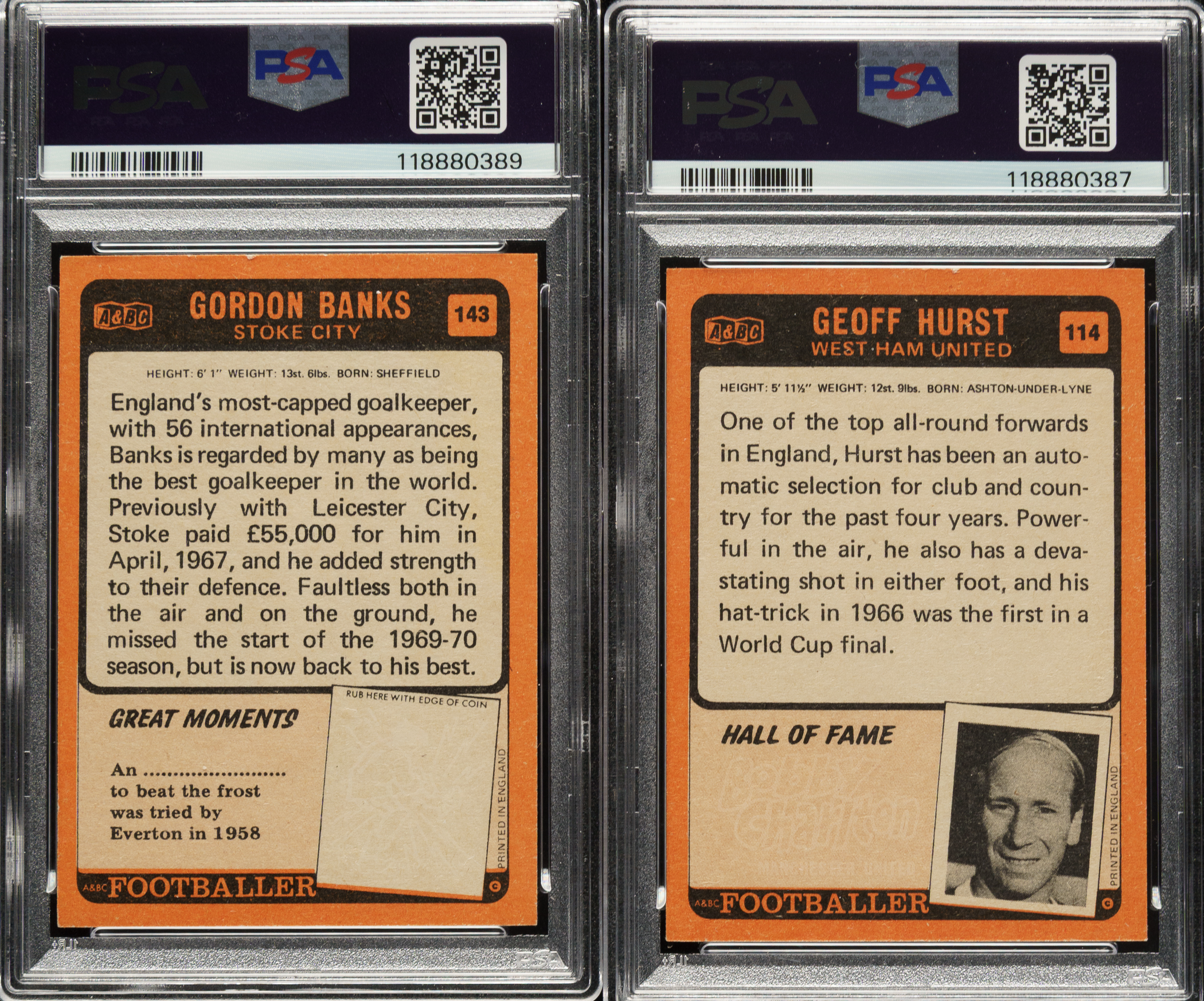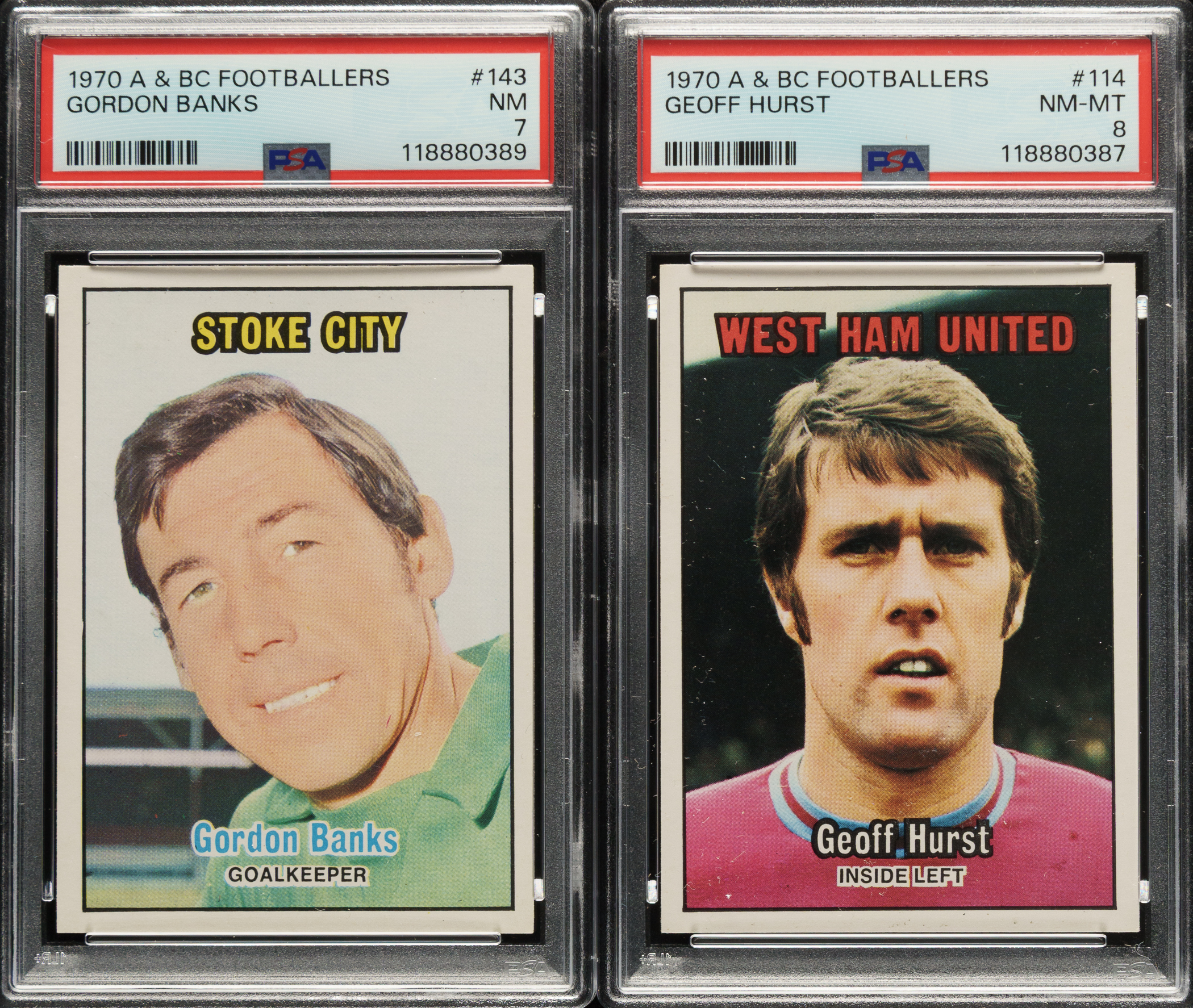 Pair of 1970 A & BC Footballers soccer cards featuring #114 Geoff Hurst (West Ham United) and #143 Gordon Banks (Stoke City). Both cards have been graded and encapsulated by PSA. This pair consists of the following: Hurst (NM-MT 8) and Banks (NM 7). Total: 2 cards.