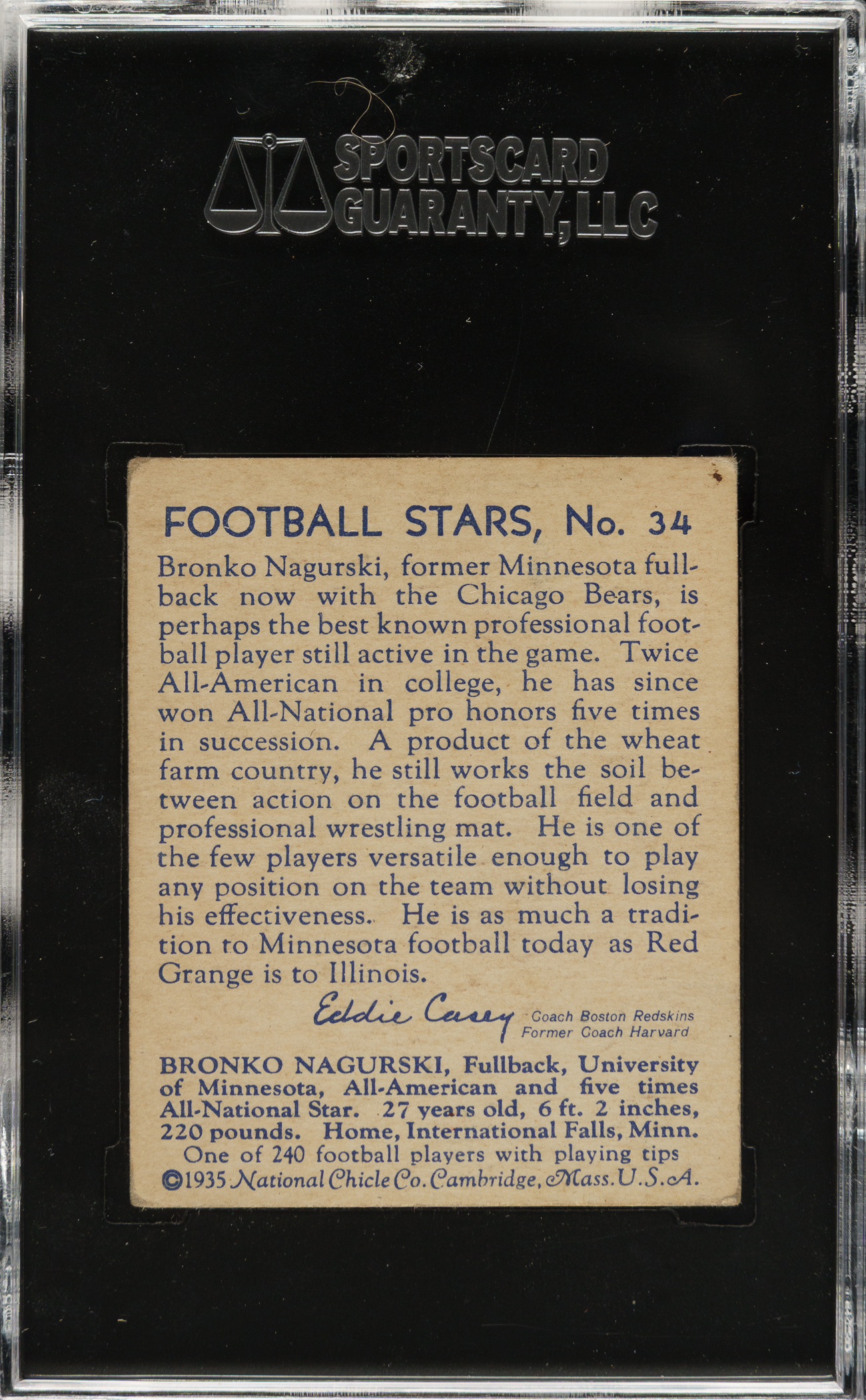 Graded EX+ 5.5 by SGC. Stunning mid-grade example of the most famous and highly prized key football card rarity: Bronko Nagurski in the 1935 National Chicle Football Stars set. The offered example is exceptionally bright and clean, with strong colors, even corner wear, and crisp registration. The image is well-centered. The reverse is clean with bold blue print. Nagurski's rookie card is one of the most popular and recognizable football cards from any era. This card is always highly sought-after, on any short list of the hobby's most classic football cards and, of course, very rare to find in any grade. This is a beautiful example that would be a worthy addition to any mid-grade R331 National Chicle set or world-class classic Hall of Fame football-card collection.