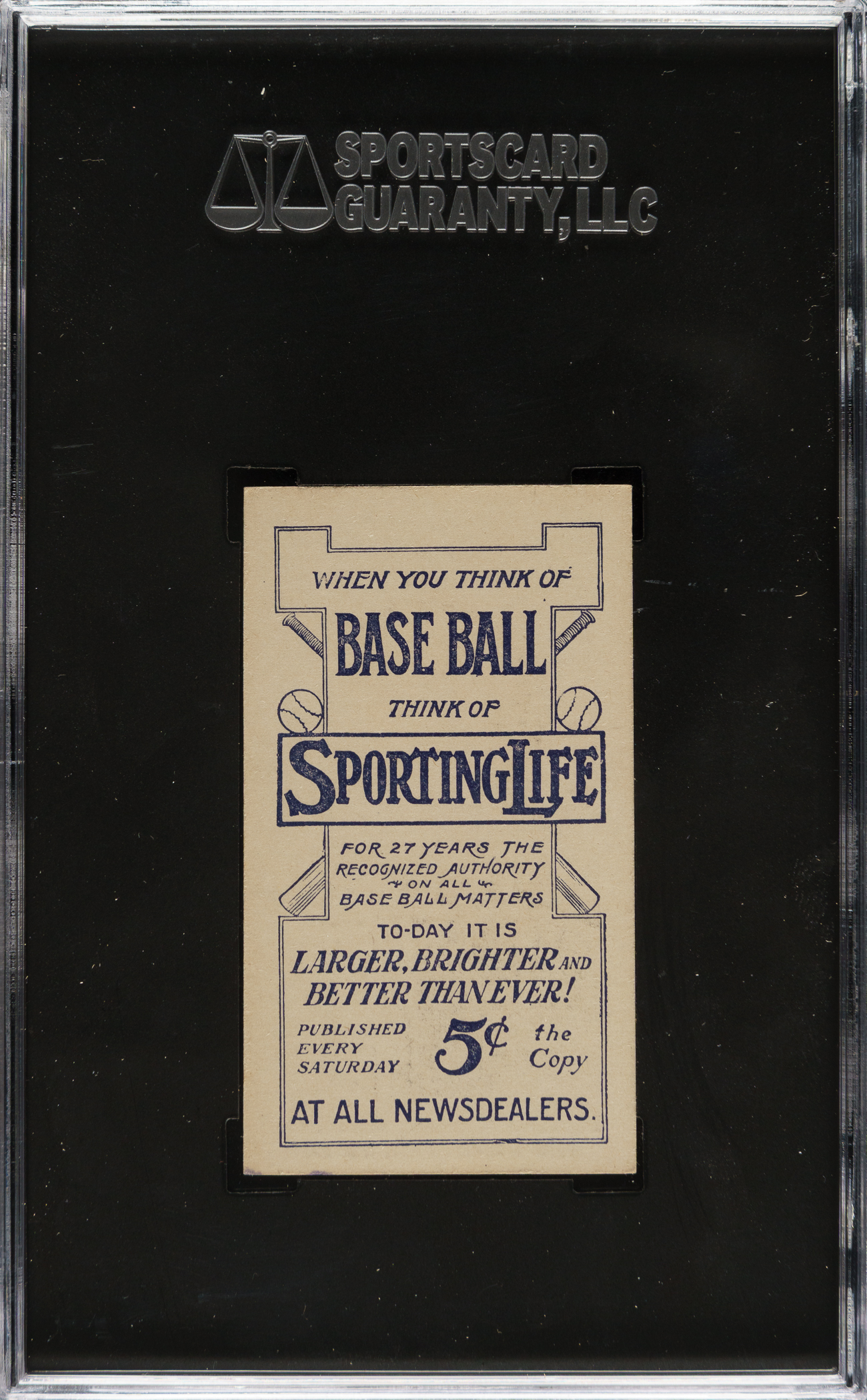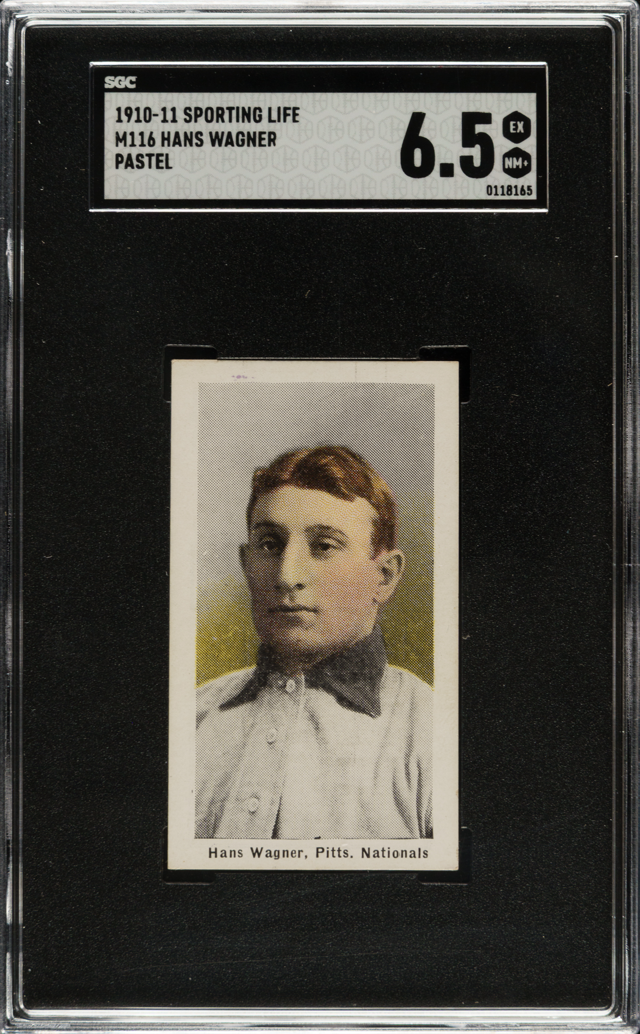 Graded EX/NM+ 6.5 by SGC. Tremendous high-grade example of one of the most famous cards of the 1910 era: Pittsburgh Pirates Hall of Famer Honus Wagner from the M116 Sporting Life series. This card is popular on many counts, including the fact that the portrait is so similar in appearance to the famous T206 Wagner and dates from the same era. Wagner is one of the key cards of the series. The card is bright and clean with a striking, crisp image, outstanding centering, and strong corners. The advertising on the reverse for Sporting Life is printed boldly in blue. This is a superb example that would be a highlight in any M116 Sporting Life, Honus Wagner, or Hall of Fame card collection.