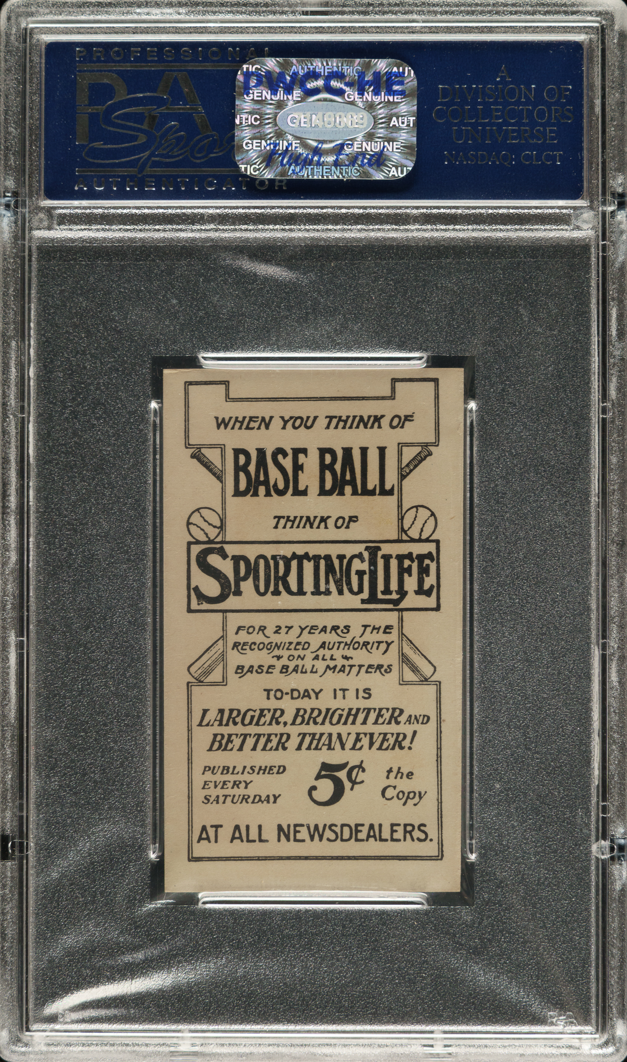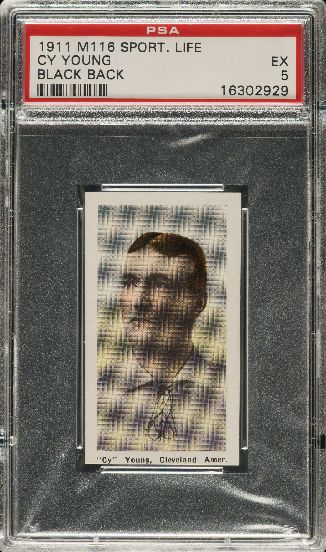 Graded EX 5 by PSA. Beautiful example of Hall of Fame pitcher Cy Young, one of the key cards in the M116 Sporting Life set. The offered card has superb image quality, light corner wear, and excellent centering. The black-back Sporting Life advertisement is boldly printed. This card represents an excellent value, in our opinion, especially compared to other quality 1910-era issues featuring Young. This is a high-quality vintage card in an extremely desirable grade that would be a worthy addition to an M116, Cy Young, or classic Hall of Fame card collection.