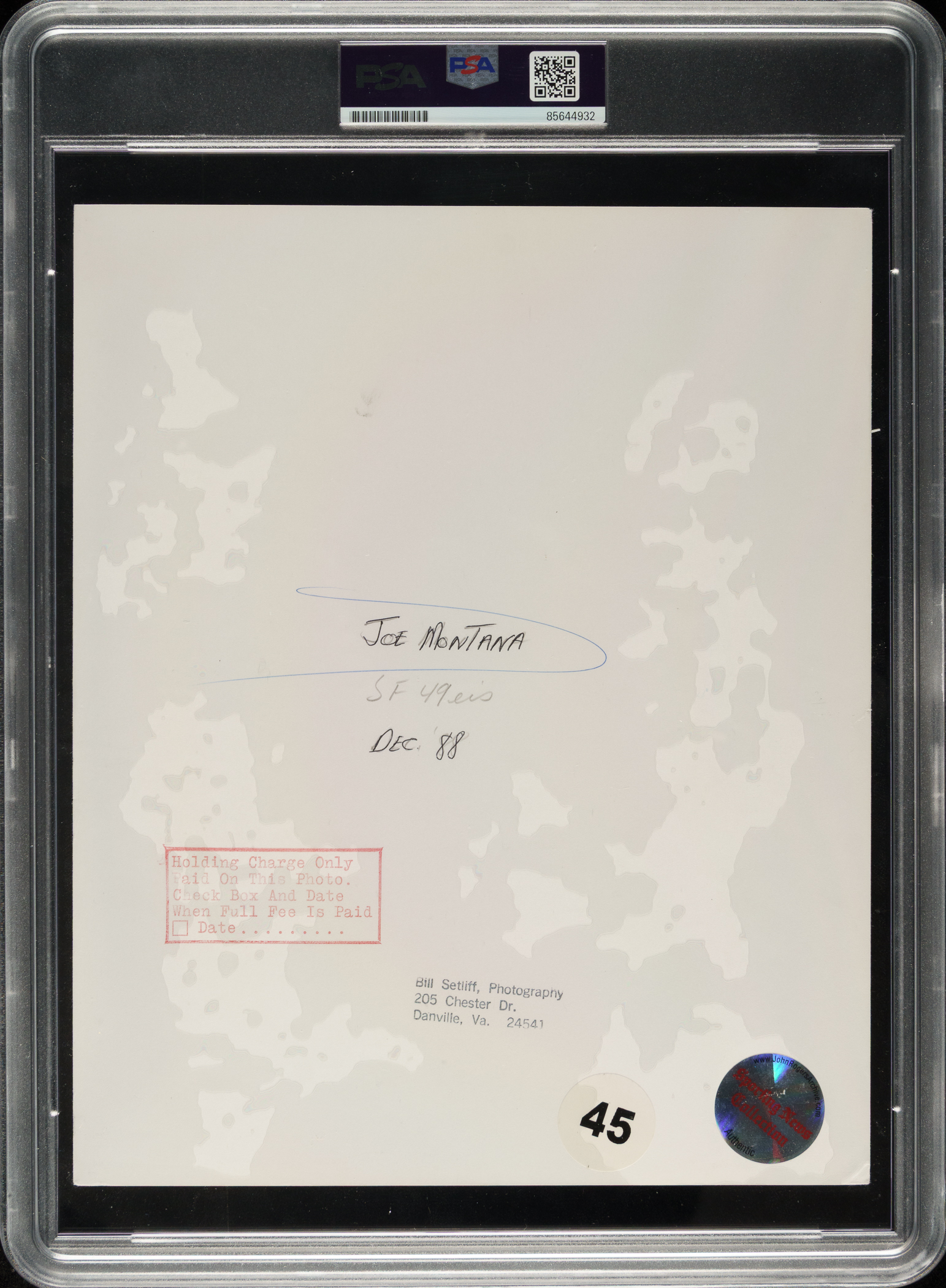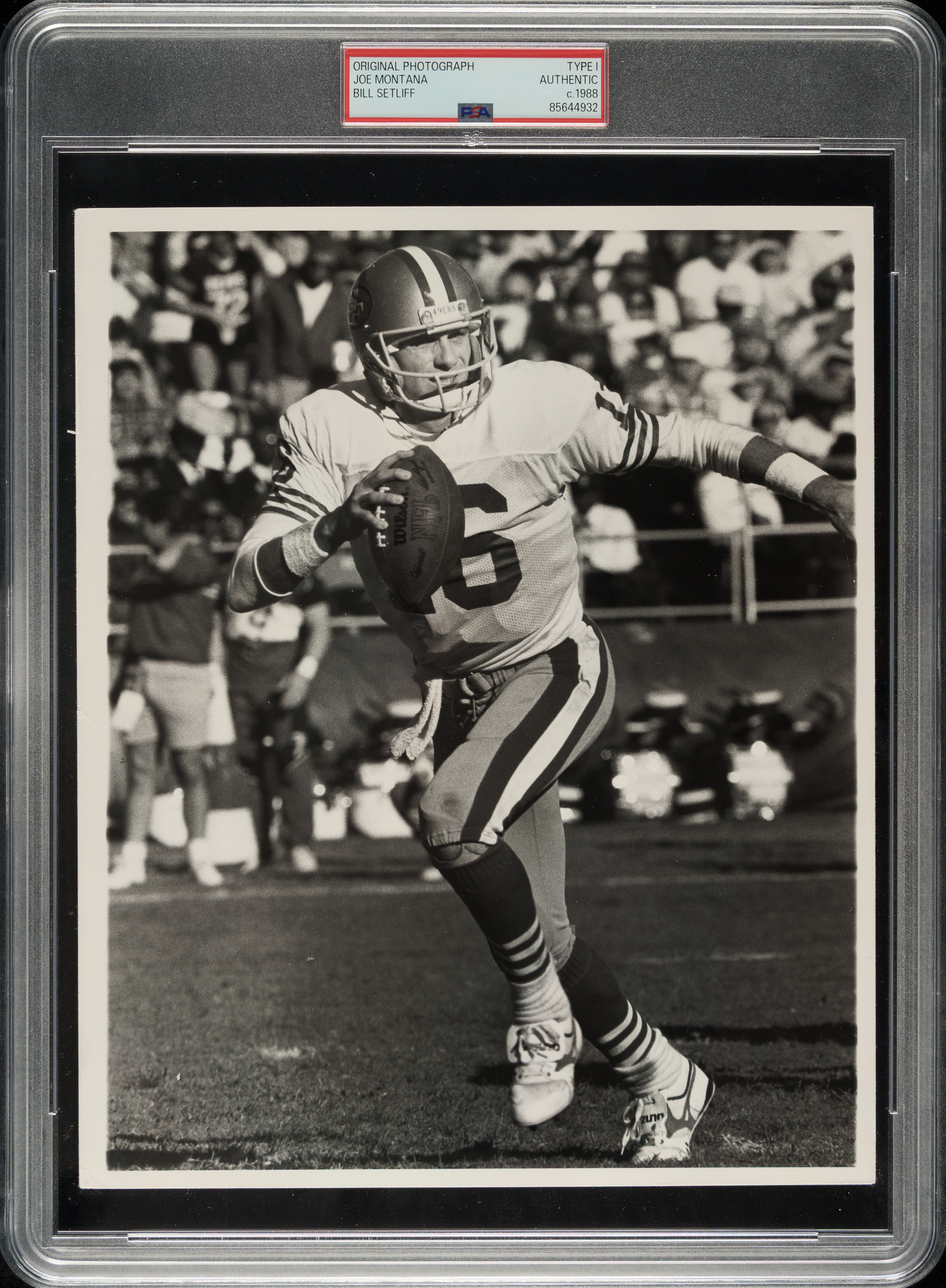Original photo of Hall of Fame quarterback Joe Montana as a member of the San Francisco 49ers, circa 1988. Encapsulated and certified as an original Type I photograph by PSA/DNA. The reverse bears a credit stamp for photographer Bill Seliff, a "Sporting News Collection" hologram label, and the editorial notation "Joe Montana/S.F. 49ers/Dec '88." The photo (8-1/8 x 10 inches) displays a small tear along the left border and light creasing. Very Good to Excellent condition overall.