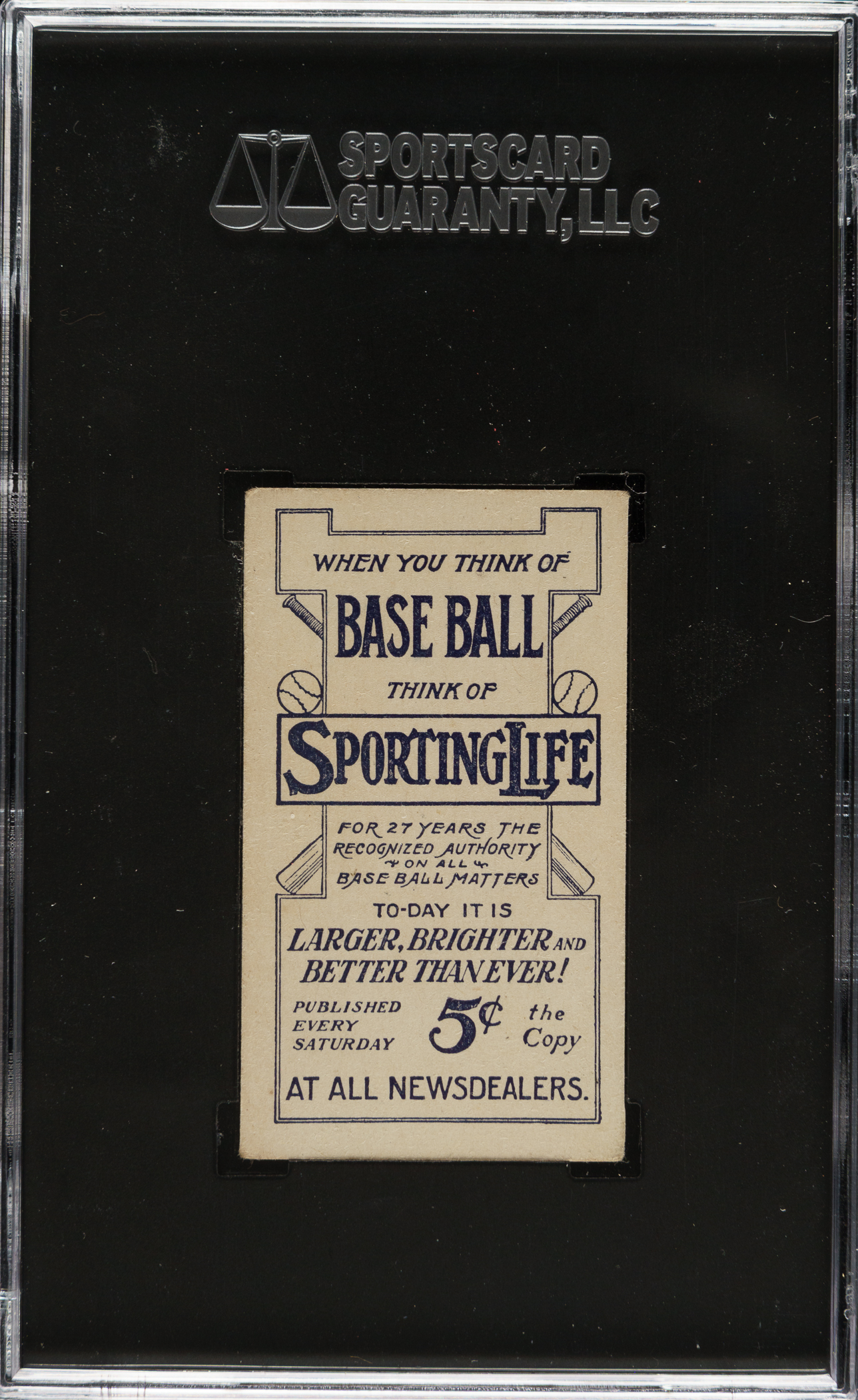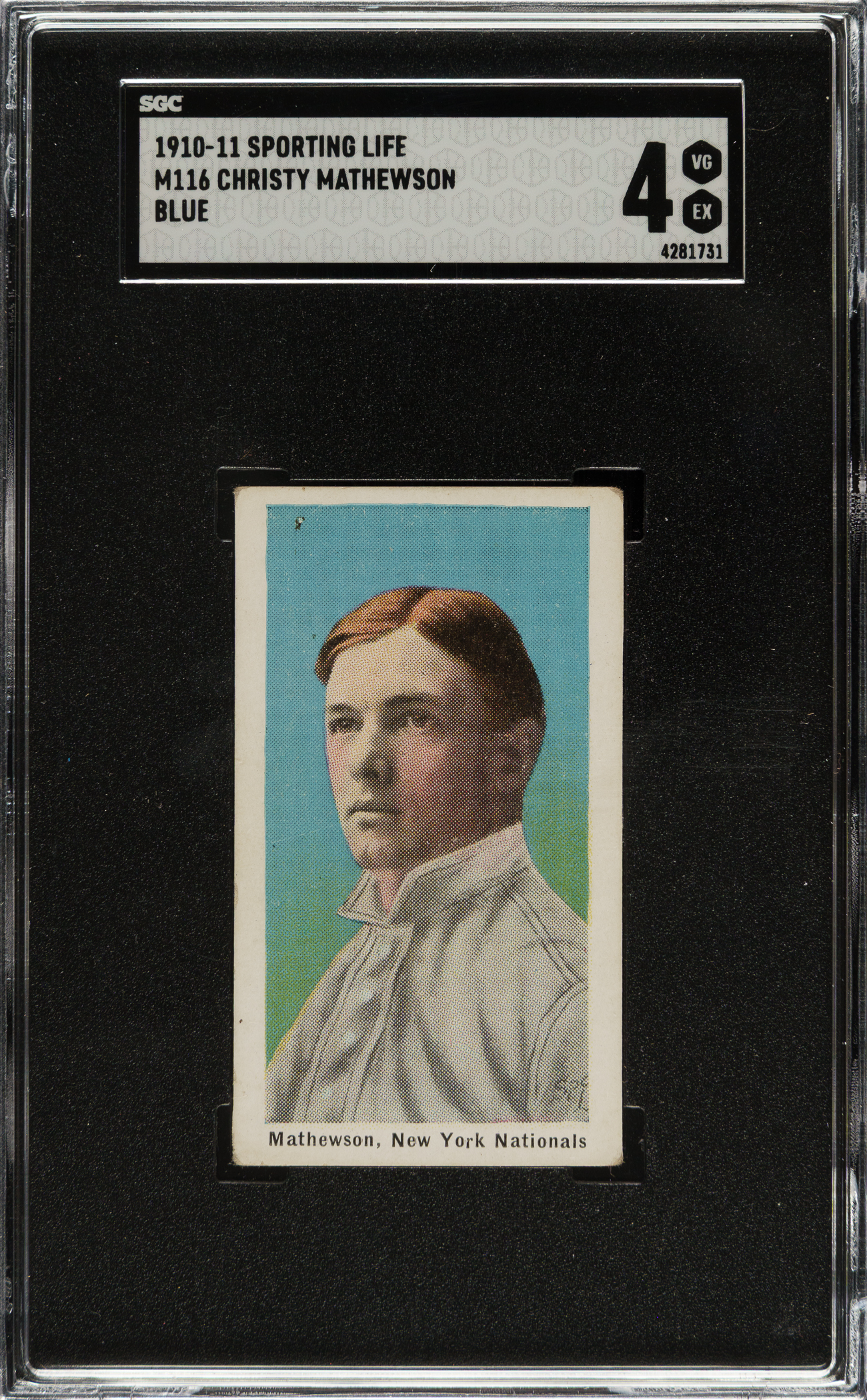 Graded VG/EX 4 by SGC (submitted by REA). Very attractive example of New York Giants Hall of Famer Christy Mathewson from the prized "Blue Background" series of the M116 Sporting Life set, one of the most popular of all 1910-era issues. M116s have always been highly appreciated by collectors for their distinctive style and rarity relative to the more commonly seen tobacco cards of the era. Christy Mathewson is one of the key cards of the series, and the offered example features the portrait of Mathewson set against a blue background. M116 Sporting Life cards were issued in sets of 12 cards per series, and the “Blue Background” cards are by far the most desirable combination of series within the entire set. These 24 cards were issued with both blue backgrounds and white backgrounds. The “Blue Background” cards have always been especially appreciated by collectors for their scarcity and distinctive style. The card is bright and clean both front and back, with outstanding color, flawless registration, even corner wear, no creases, and an extremely bold blue background. The Sporting Life advertisement on the reverse is boldly printed. This is a stunning mid-grade example of one of Christy Mathewson's most distinctive and popular portrait cards.