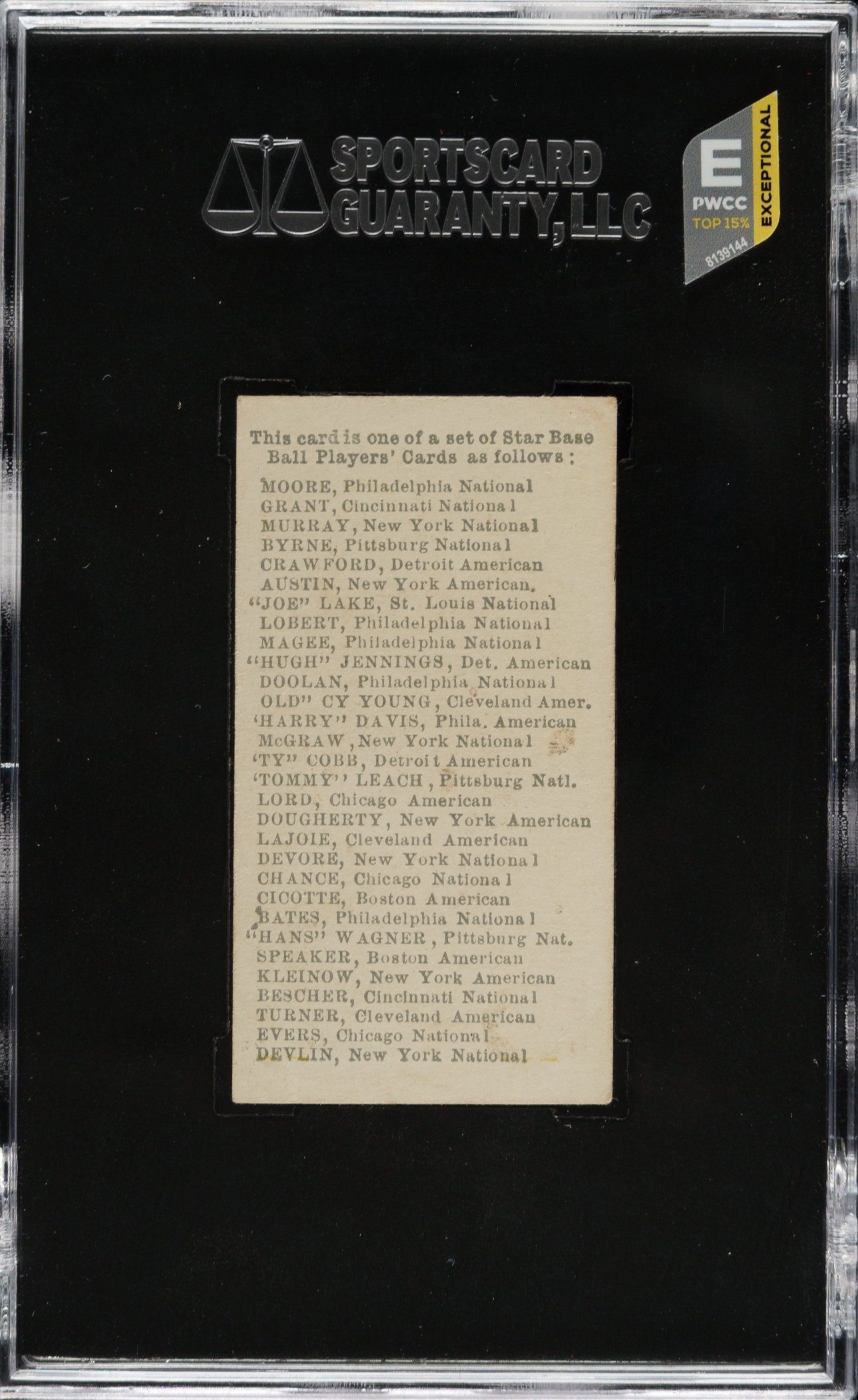 Graded EX 5 by SGC. Only three examples have been graded higher by SGC. Presented is an outstanding example of Detroit Tigers Hall of Famer Ty Cobb from the E94 George Close Candy set, one of the most popular and highly collected of all 1910-era caramel-card sets. The E94 Cobb is considered by many to be among Cobb's most classic cards. While at a glance E94s might be easily confused with other caramel-card sets of the era (E93 and E98 specifically), they are an entirely different set, even though they use many of the same subjects and poses. The E94 caramel-card set is usually associated with the George Close Co. of Cambridge, Mass. While the majority of the E94 cards do not have any sort of advertisement on the back, some have been found with overprints that make reference to this company. This example has a crisp image set against a striking gold background, light corner wear, and excellent centering. The reverse features a checklist for the set. Caramel cards are rarely found in high grade. This is a superb example of the legendary "Georgia Peach" from this extremely scarce and classic 1910-era candy issue.