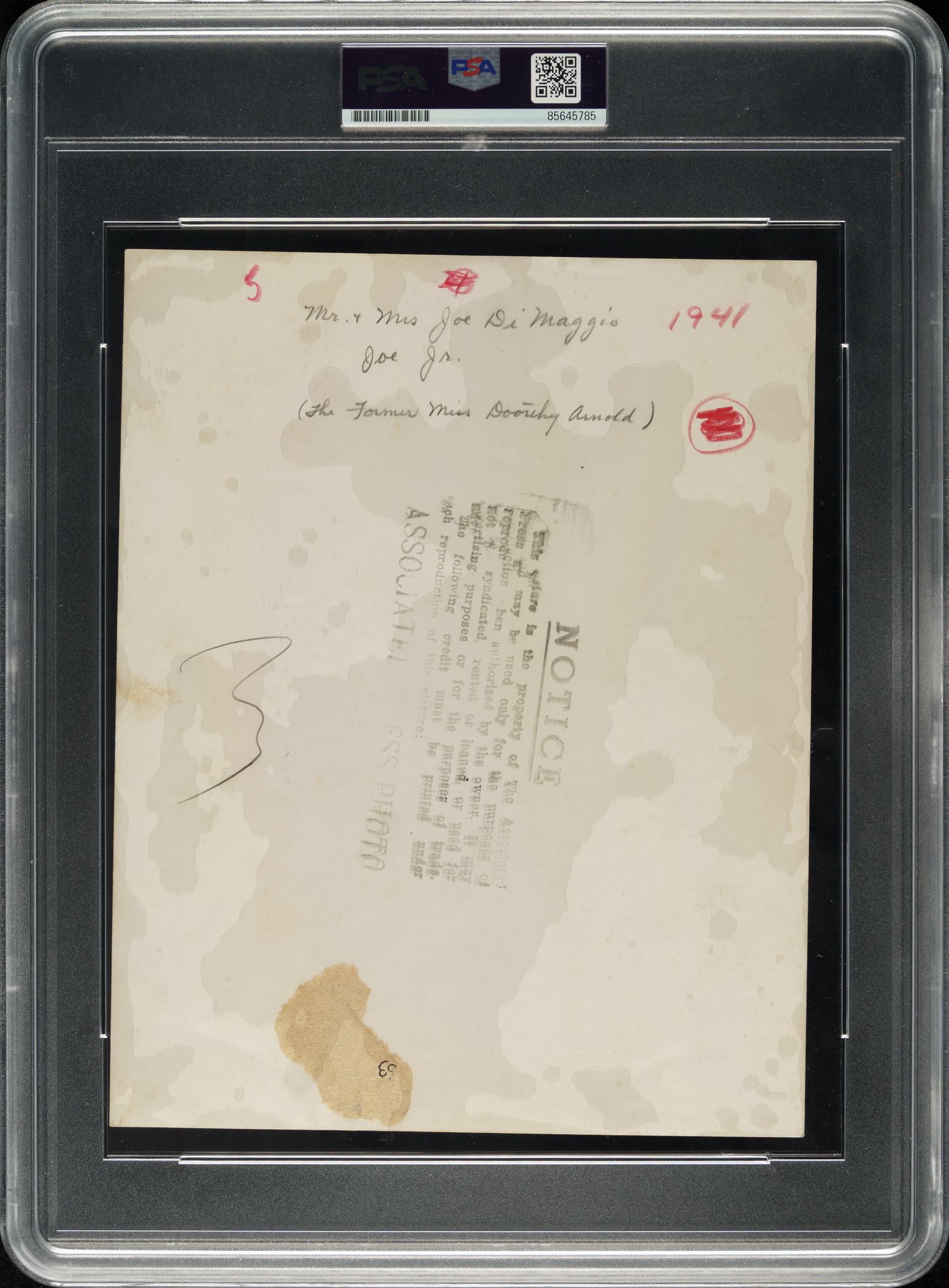 Encapsulated and certified as an original Type I photograph by PSA/DNA. New York Yankees Hall of Famer Joe DiMaggio. Dimensions: 7-1/8 x 9 inches.