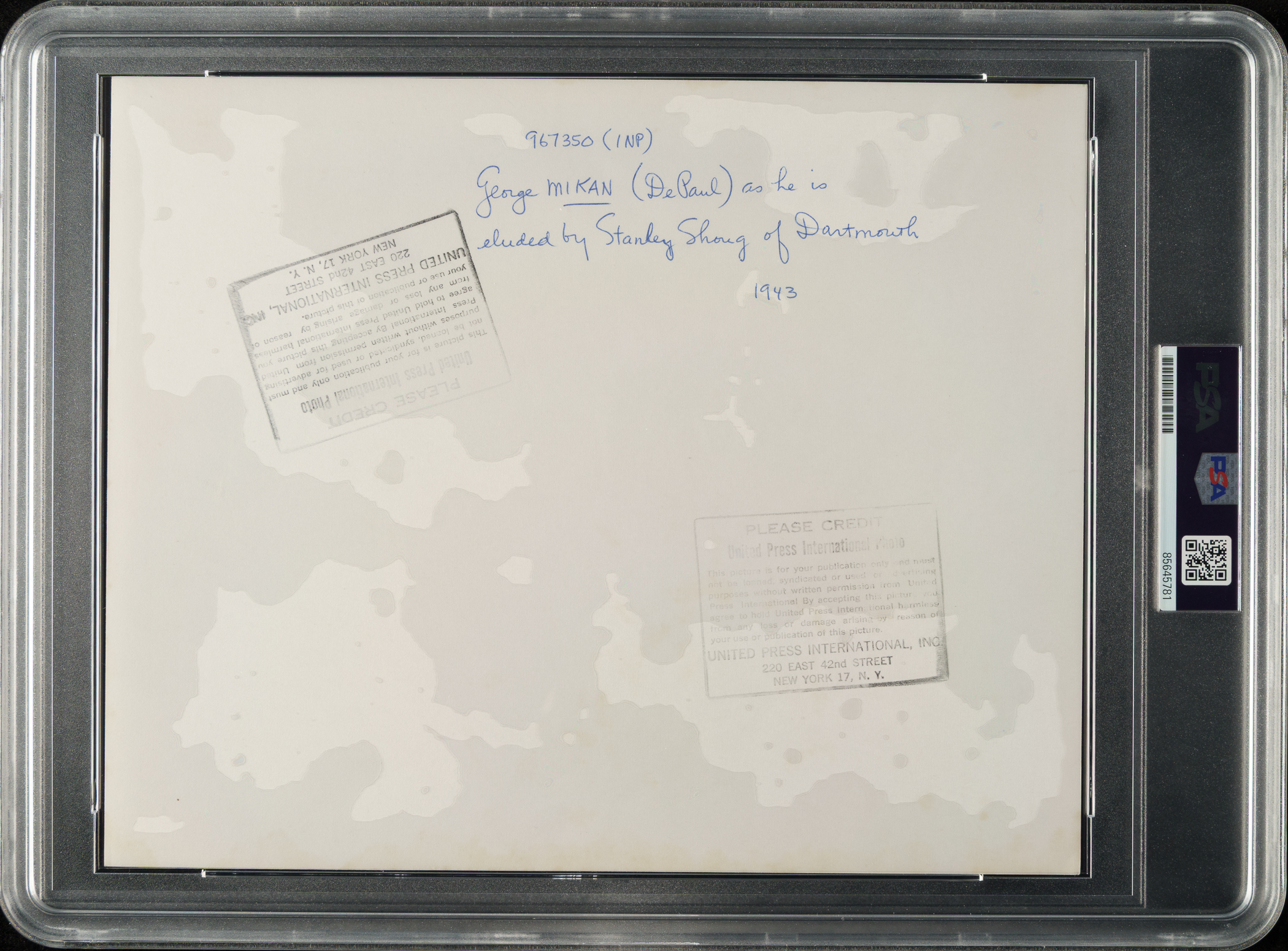 Encapsulated and certified as an original Type II photograph by PSA/DNA. DePaul Blue Demons/Minneapolis Lakers Hall of Famer George Mikan. Dimensions 8-1/8 x 10 inches.