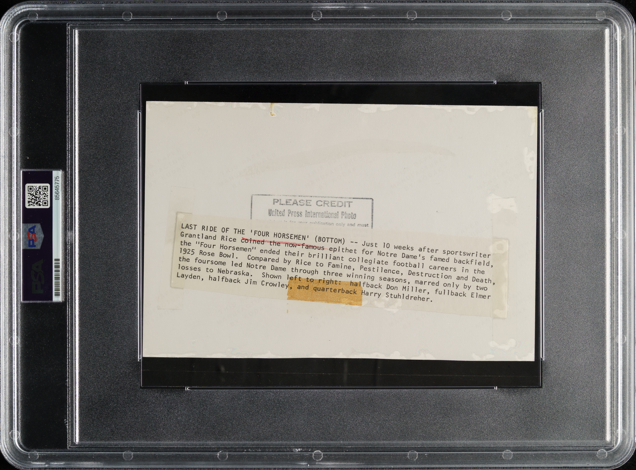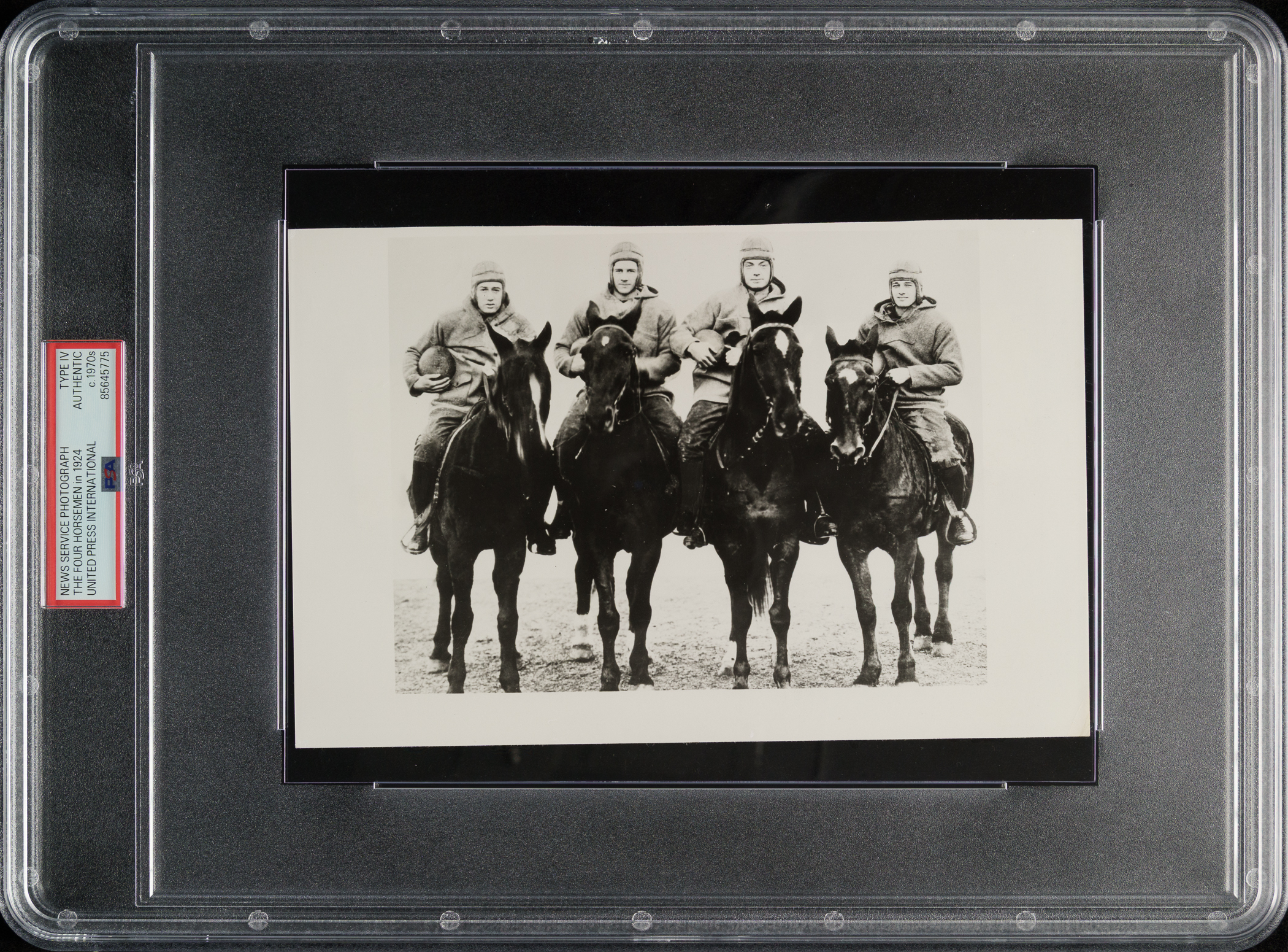 Encapsulated and certified as an original Type IV photograph by PSA/DNA. Harry Stuhldreher, Don Miller, Jim Crowley, and Elmer Layden of the University of Notre Dame. Dimensions: 5-1/4 x 8-1/8 inches.