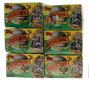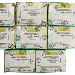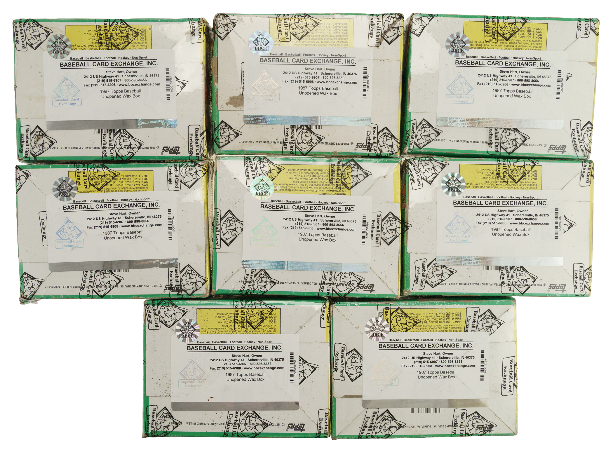 Collection of eight original unopened wax boxes of 1987 Topps baseball. Each box houses 36 packs with each pack containing 17 cards, for a total of 4,896 cards. The 1987 Topps set includes the rookie cards of Barry Bonds, Bo Jackson, Will Clark, Barry Larkin, and Rafael Palmeiro, and key cards of Roger Clemens, Mark McGwire, and Nolan Ryan. Each box comes shrink-wrapped by Baseball Card Exchange (owned by Steve Hart, the foremost expert on unopened material). The boxes are accompanied by the original outer case. Total: 8 boxes plus original outer case. The size/weight of this item requires that there will be an additional shipping charge for this lot.
