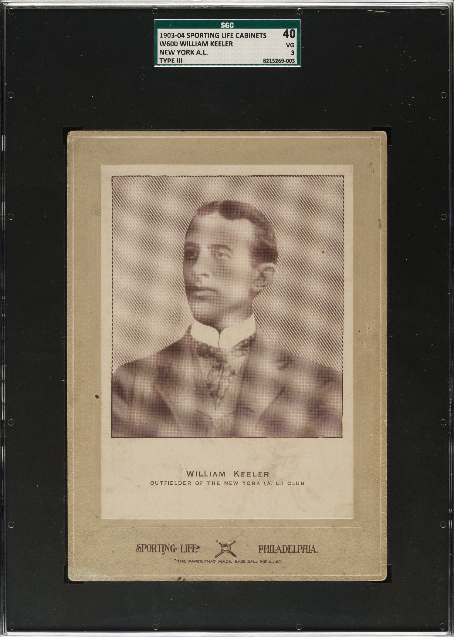 Graded VG 40 by SGC. Rarely offered W600 Sporting Life series cabinet-card featuring Hall of Fame outfielder "Wee Willie" Keeler as a member of the New York Highlanders. Two variations of Keeler (both dressed in a suit) were issued in W600: one with a Brooklyn NL team designation (1902) and one with a New York AL team designation (1903). The offered example is the latter "New York" variation. Extremely bright and crisp, with even corner wear and outstanding image quality. A small stain is visible on the bottom left corner. The blank reverse is lightly soiled. W600 Sporting Life cabinet cards were available only by mail and they are universally recognized as among the most substantial and highest-quality baseball-card sets ever issued. This is a solid mid-grade example of one of the most desirable of all W600 Hall of Famers, and one of Willie Keeler's rarest and most impressive cards.