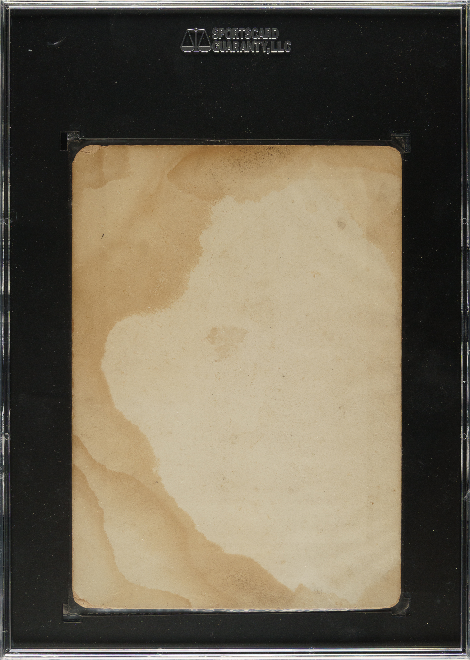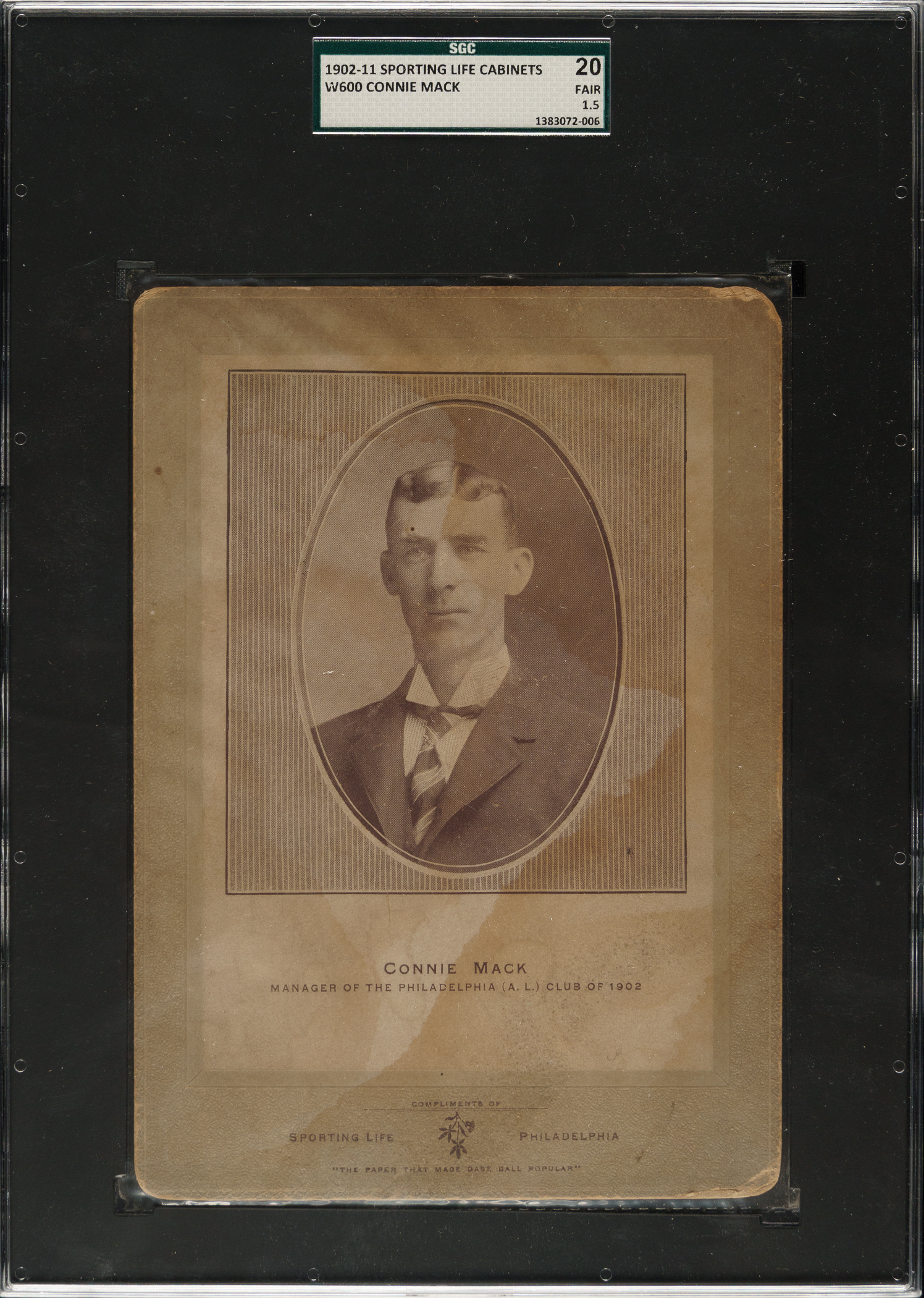 Presented is a very attractive yet modestly graded example of legendary Philadelphia Athletics Hall of Fame manager Connie Mack dressed in a suit from the very popular W600 Sporting Life cabinet-card set. Mack is one of the key Hall of Famers from this extremely substantial cabinet-card set, which is one of the highest-quality baseball-card issues ever produced. This is also one of the rarest and most desirable of all the cards ever issued of Connie Mack. Graded FAIR 20 by SGC due to obvious condition flaws including rounded corners and staining front and back. The card otherwise displays a strong image. W600 Sporting Life cabinet cards were available only by mail. Despite these flaws, this remains an extremely impressive example of a very desirable card, which would be a worthy addition to any Connie Mack, W600, or prewar-card collection.