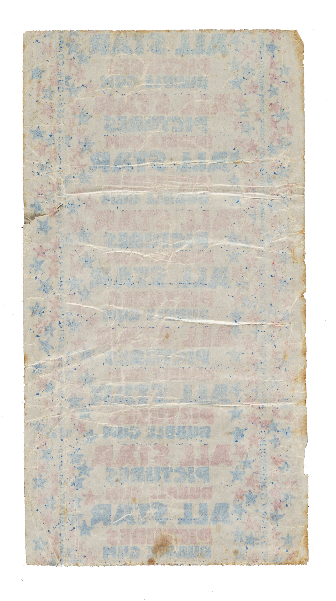 This original wax wrapper features red and blue repeating "All Star Pictures Bubble Gum" text, along with stars and manufacturer information on each side, against a white background. Flattened to dimensions of 3-1/2 x 6-3/4 inches, the wrapper displays normal folds lines, scattered wrinkling, toning along the edges, and a small tear along the right edge. Overall Fair appearance.