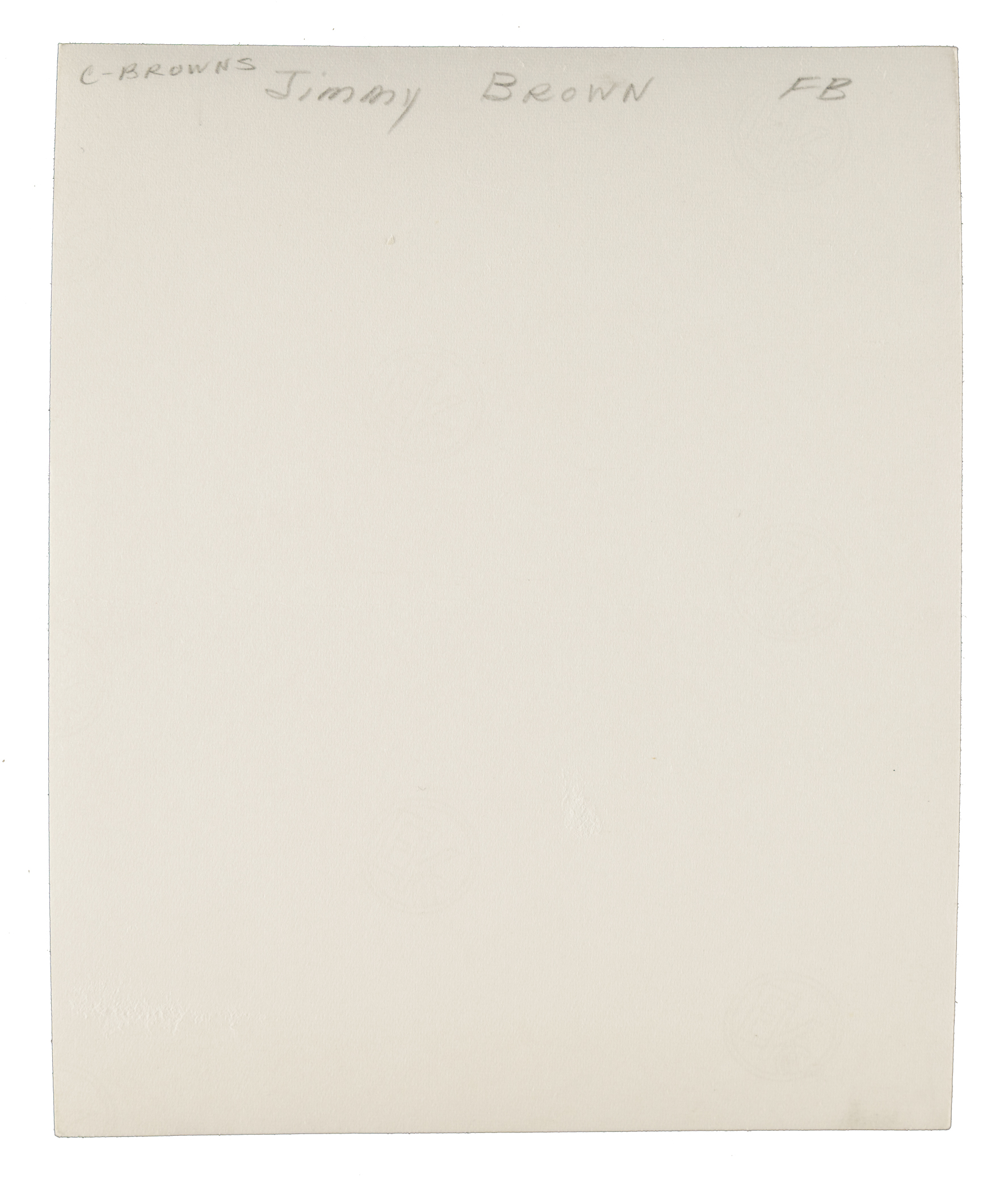 Original color photograph used in the production of Jim Brown's 1962 Post Cereal football card. Brown is pictured in uniform holding a football. This photo was used as a component of the art board that was created during the production process. The notation "C-Browns/Jimmy Brown/FB" is printed in pencil on the reverse. The photo (4 x 4-7/8 inches) remains in Good condition overall.