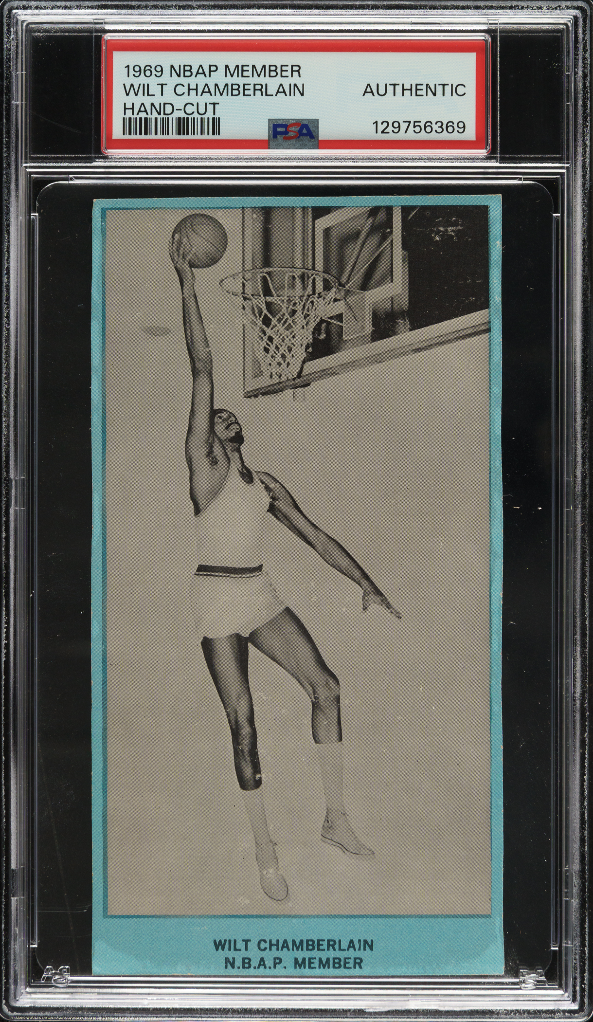 Rarely offered example of Los Angeles Lakers Hall of Famer Wilt Chamberlain from the circa 1969 N.B.A.P. Member basketball-card series. This unusual series is one of the most mysterious basketball issues of the 1960s and, to this day, no one knows exactly what company issued them, or even exactly how they were issued, although it was always clear they were cut from something (possibly a Converse basketball shoe box). The cards feature black-and-white photos surrounded by light blue borders, with the player's name and "N.B.A.P. Member" printed below the image. The reverses are blank. This is only the third time we have offered an example from this series in the past 21 years. (Amazingly, we have a total of seven examples in this current auction.) The offered example displays light creasing and an entirely clean reverse. Encapsulated as "Authentic" (submitted by REA) by PSA due to being hand cut. Only two examples graded higher by PSA. This is a very attractive example of one of Chamberlain's most elusive cards from one of the 1960s' most fascinating and unusual sets.