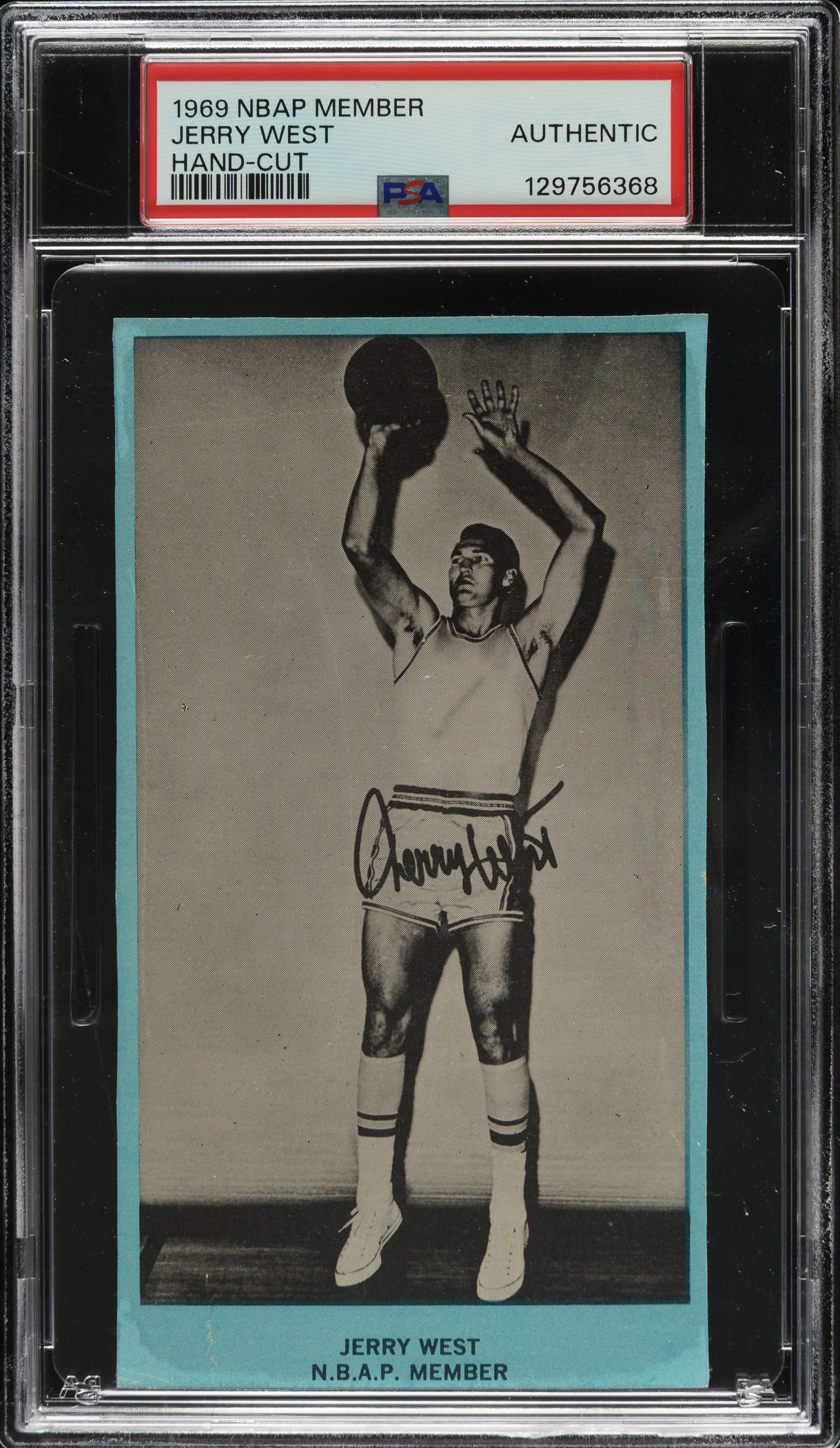 Rarely offered example of Los Angeles Lakers Hall of Famer Jerry West from the circa 1969 N.B.A.P. Member basketball-card series. This unusual series is one of the most mysterious basketball issues of the 1960s and, to this day, no one knows exactly what company issued them, or even exactly how they were issued, although it was always clear they were cut from something (possibly a Converse basketball shoe box). The cards feature black-and-white photos surrounded by light blue borders, with the player's name and "N.B.A.P. Member" printed below the image. The reverses are blank. This is only the third time we have offered an example from this series in the past 21 years. (Amazingly, we have a total of seven examples in this current auction.) The offered example displays light creasing and an entirely clean reverse. Encapsulated as "Authentic" (submitted by REA) by PSA due to being hand cut. One of only six examples graded by PSA. This is a very attractive example of one of Jerry West's most elusive cards from one of the 1960s' most fascinating and unusual sets.
