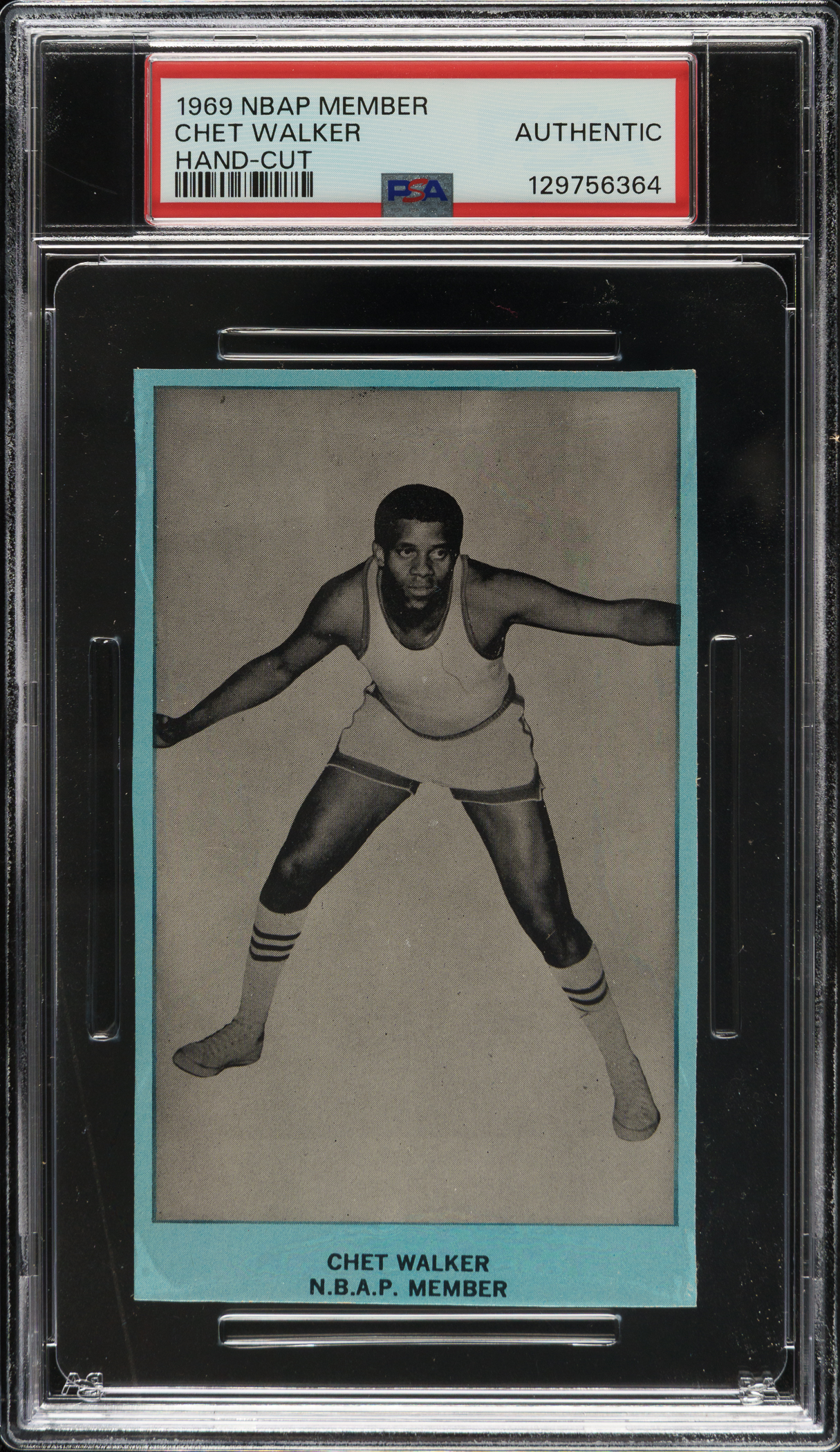 Rarely offered example of Hall of Famer Chet Walker as a member of the Chicago Bulls from the circa 1969 N.B.A.P. Member basketball-card series. This unusual series is one of the most mysterious basketball issues of the 1960s and, to this day, no one knows exactly what company issued them, or even exactly how they were issued, although it was always clear they were cut from something (possibly a Converse basketball shoe box). The cards feature black-and-white photos surrounded by light blue borders, with the player's name and "N.B.A.P. Member" printed below the image. The reverses are blank. This is only the third time we have offered an example from this series in the past 21 years. (Amazingly, we have a total of seven examples in this current auction.) The offered example displays minor corner and edge wear and an entirely clean reverse. Encapsulated as "Authentic" (submitted by REA) by PSA due to being hand cut. Only one example graded higher by PSA. This is a very attractive example of one of Chet Walker's most elusive cards from one of the 1960s' most fascinating and unusual sets.