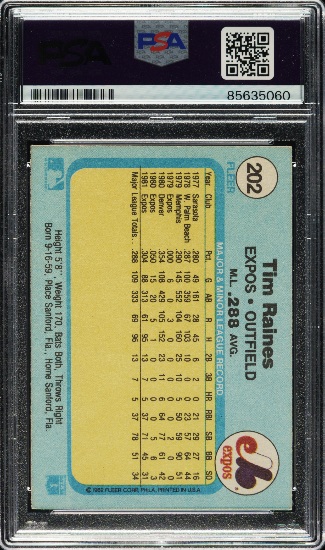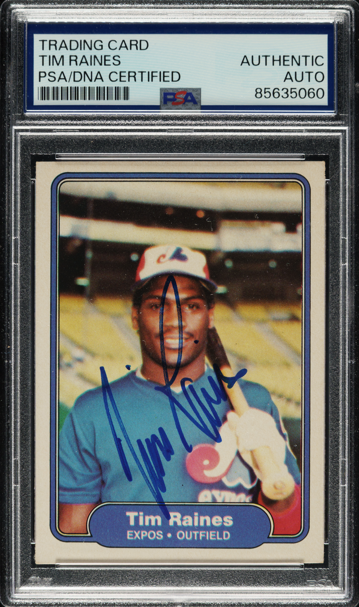 PSA/DNA has encapsulated the card, grading the signature Authentic. Montreal Expos Hall of Famer Tim Raines.