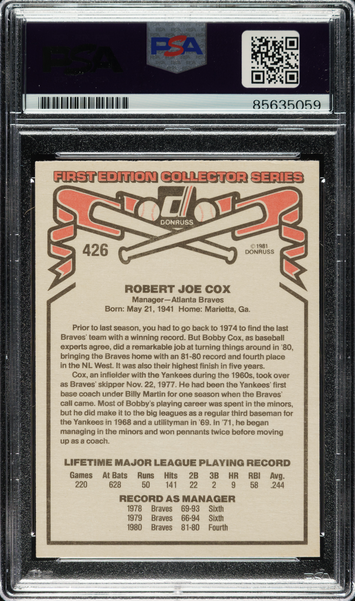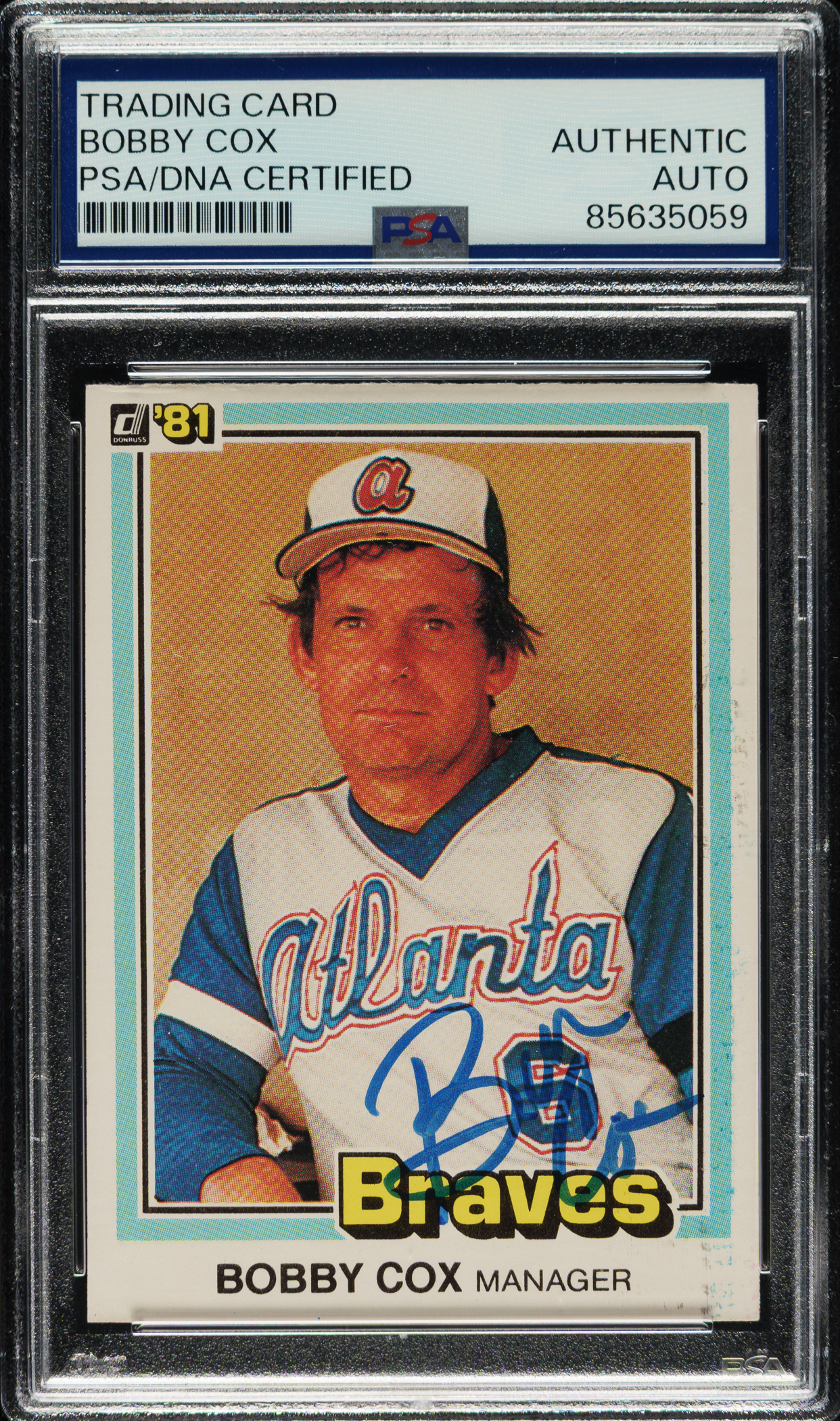 PSA/DNA has encapsulated the card, grading the signature Authentic. Atlanta Braves Hall of Famer Bobby Cox.