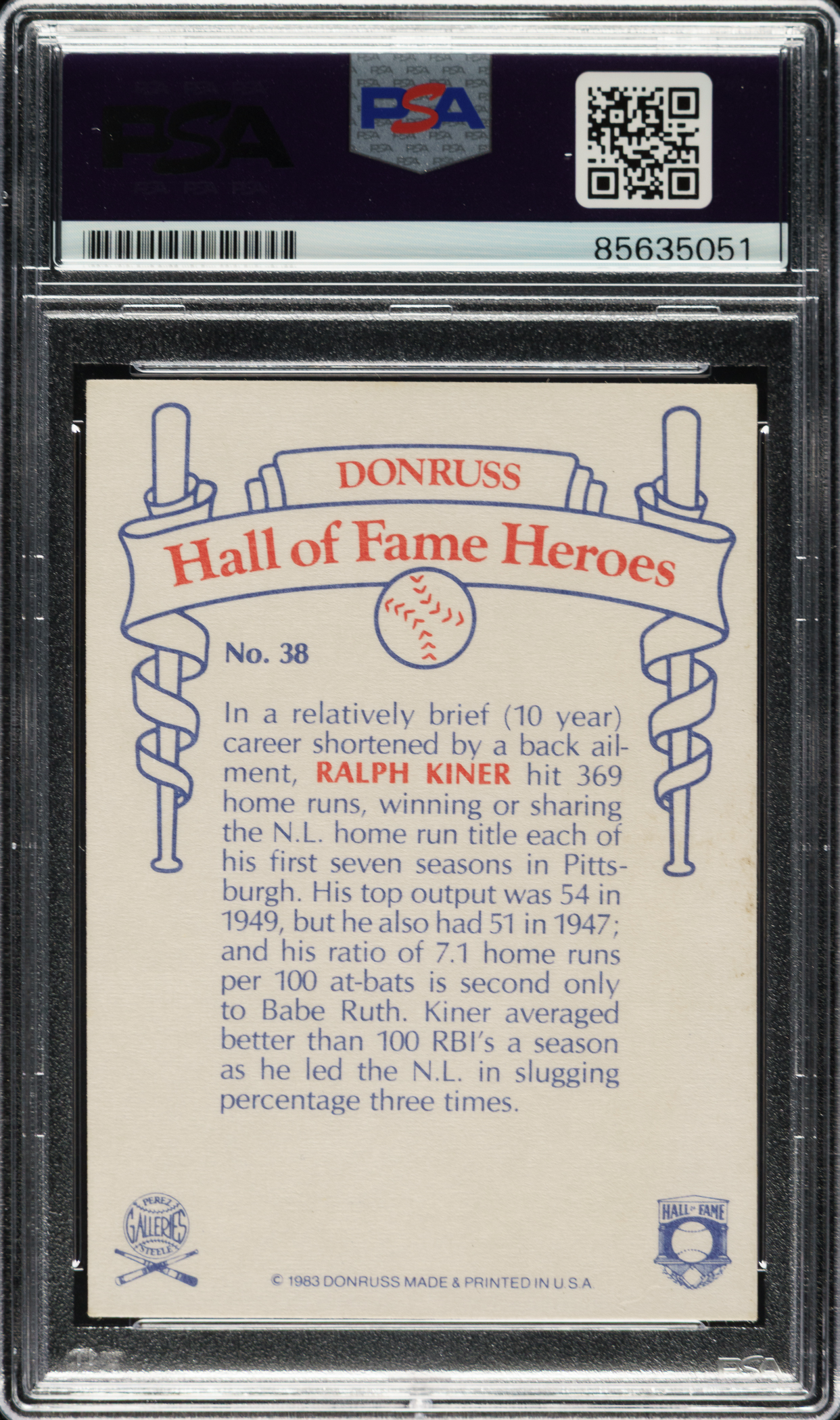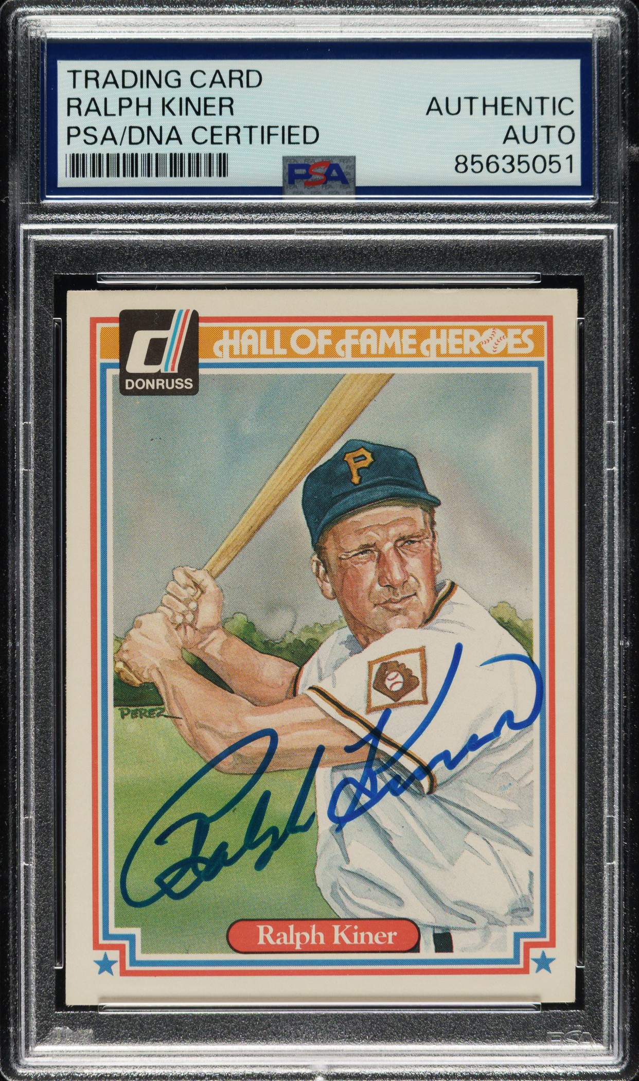 PSA/DNA has encapsulated the card, grading the signature Authentic. Pittsburgh Pirates Hall of Famer Ralph Kiner.