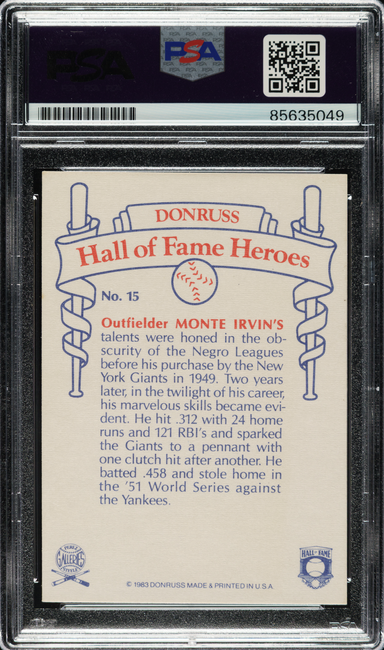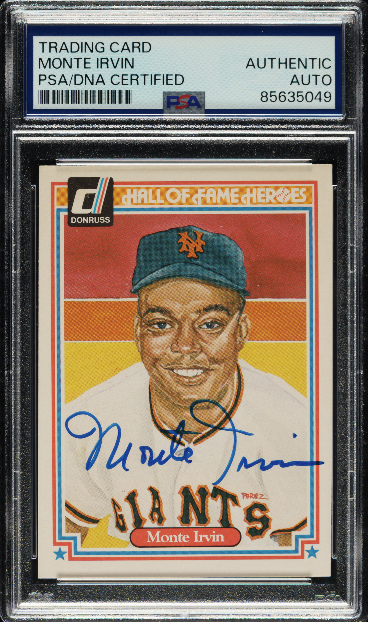 PSA/DNA has encapsulated the card, grading the signature Authentic. New York Giants Hall of Famer Monte Irvin.