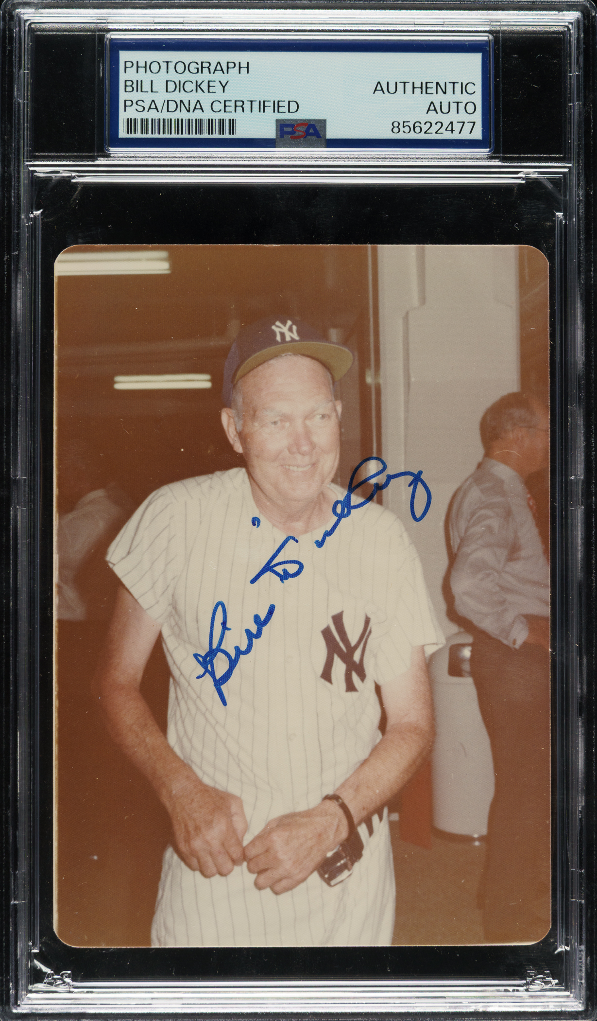 PSA/DNA has encapsulated the card, grading the signature Authentic. New York Yankees Hall of Famer Bill Dickey.