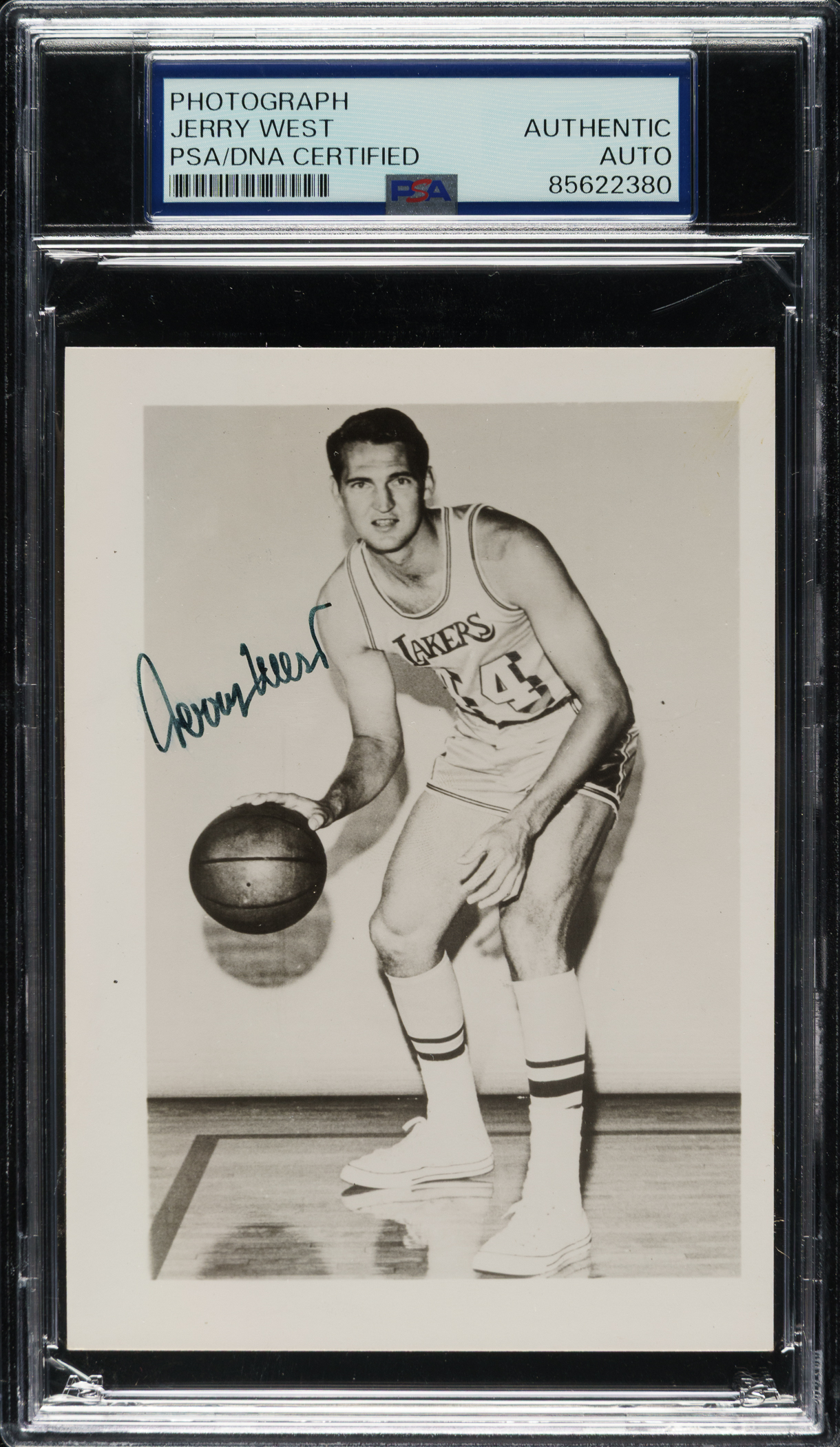 PSA/DNA has encapsulated the card, grading the signature Authentic. Los Angeles Lakers basketball Hall of Famer Jerry West.