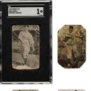 Presented is a very sizable collection of 309 cards from six different Zeenut PCL issues spanning the years 1923 to 1932 and highlighted by Lefty O'Doul and Hall of Famers Harry Hooper and Earl Averill (two different). The condition of the collection is 14% Gd to Vg (including eight Vg-Ex) and 86% Pr to Fr (including six with trimmed corners). This collection consists of the following: 1) 1923 (3 cards, all different). 2) 1926 (13 cards, all different). 3) 1927 Partial Set (84/145): Keys: Averill (trimmed corners and wax on the surfaces, otherwise Pr, HOF), Hooper (Pr, HOF), and O'Doul (Pr). 4) 1928 Partial Set (115/168): Key: Averill (SGC POOR 1). 5) 1931 (77 cards, 57 different): Key: Crosetti (trimmed around corners, otherwise Pr). 6) 1932 (17 cards, 16 different). Included are an additional 25 commons that are in such Poor condition that we did not include them in the preceding counts. As is usually the case with Zeenuts, the coupon at the bottom of each card has been clipped away, as intended, to be redeemed for valuable prizes. This is an impressive lower-grade sampling of cards from various Zeenut PCL sets. Total: 309 cards.