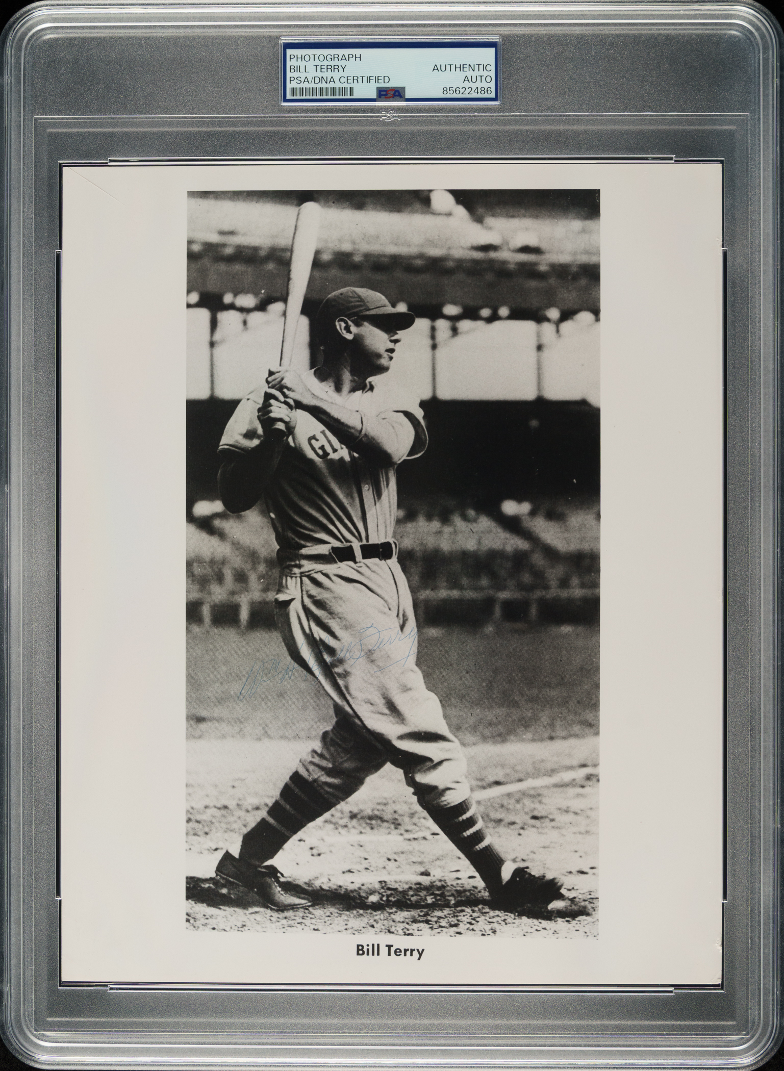 New York Giants Hall of Famer Bill Terry signed photograph. PSA/DNA has encapsulated the photograph, grading the signature Authentic.
