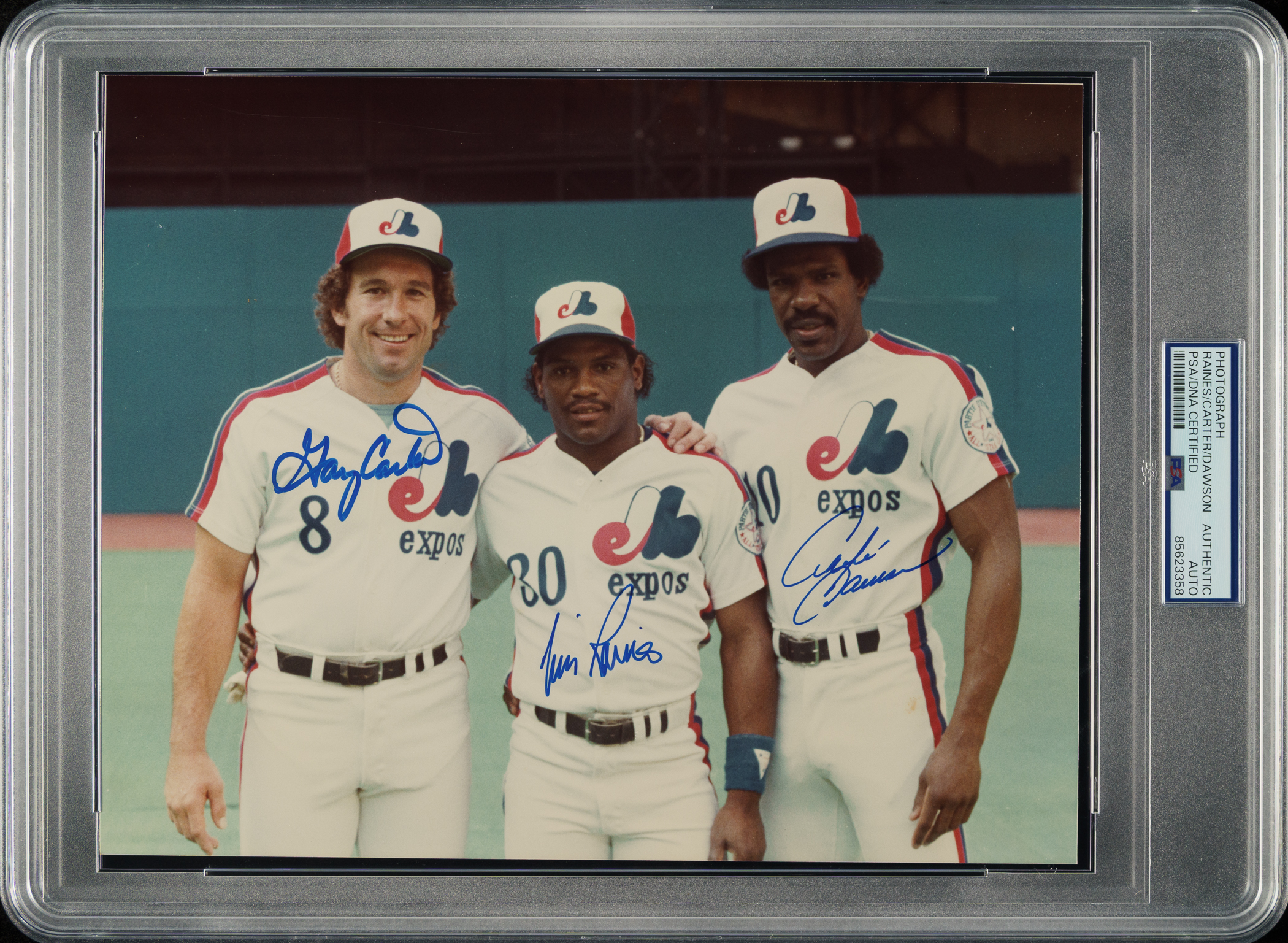 Montreal Expos Hall of Famers Gary Carter, Tim Raines and Andre Dawson signed photograph. PSA/DNA has encapsulated the photograph, grading the signature Authentic.