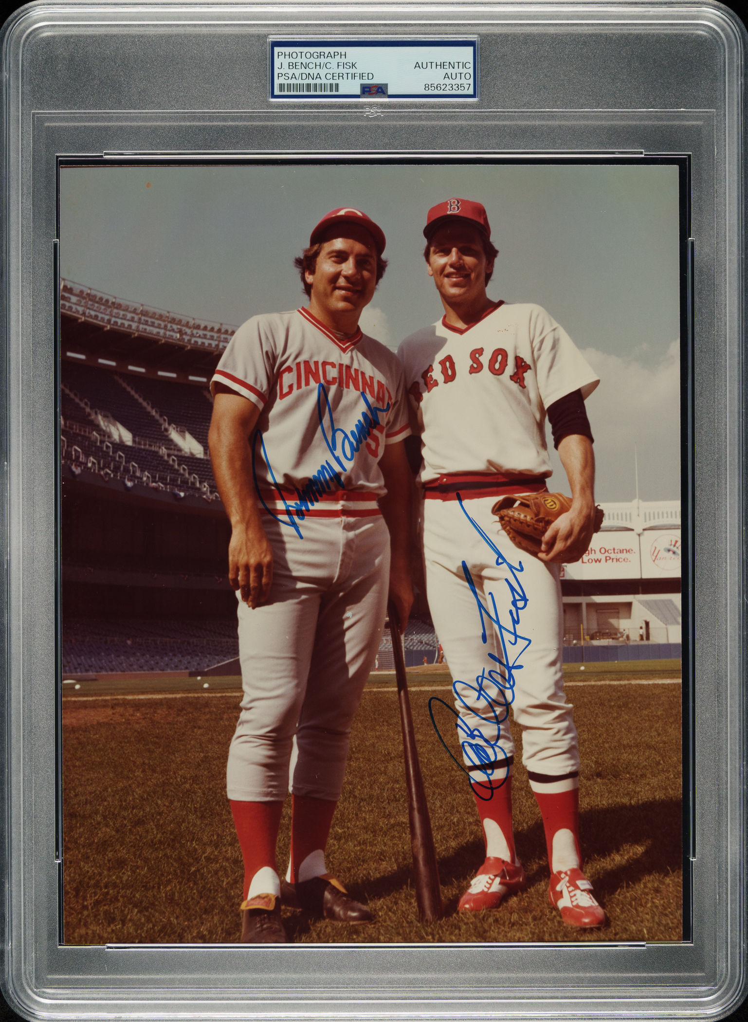 Cincinnati Reds and Boston Red Sox Hall of Famers Johnny Bench and Carlton Fisk signed photograph. PSA/DNA has encapsulated the photograph, grading the signature Authentic.