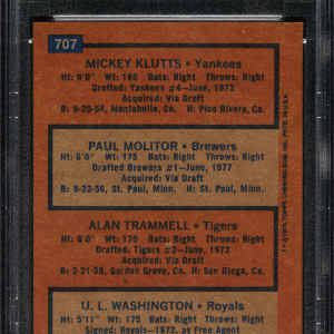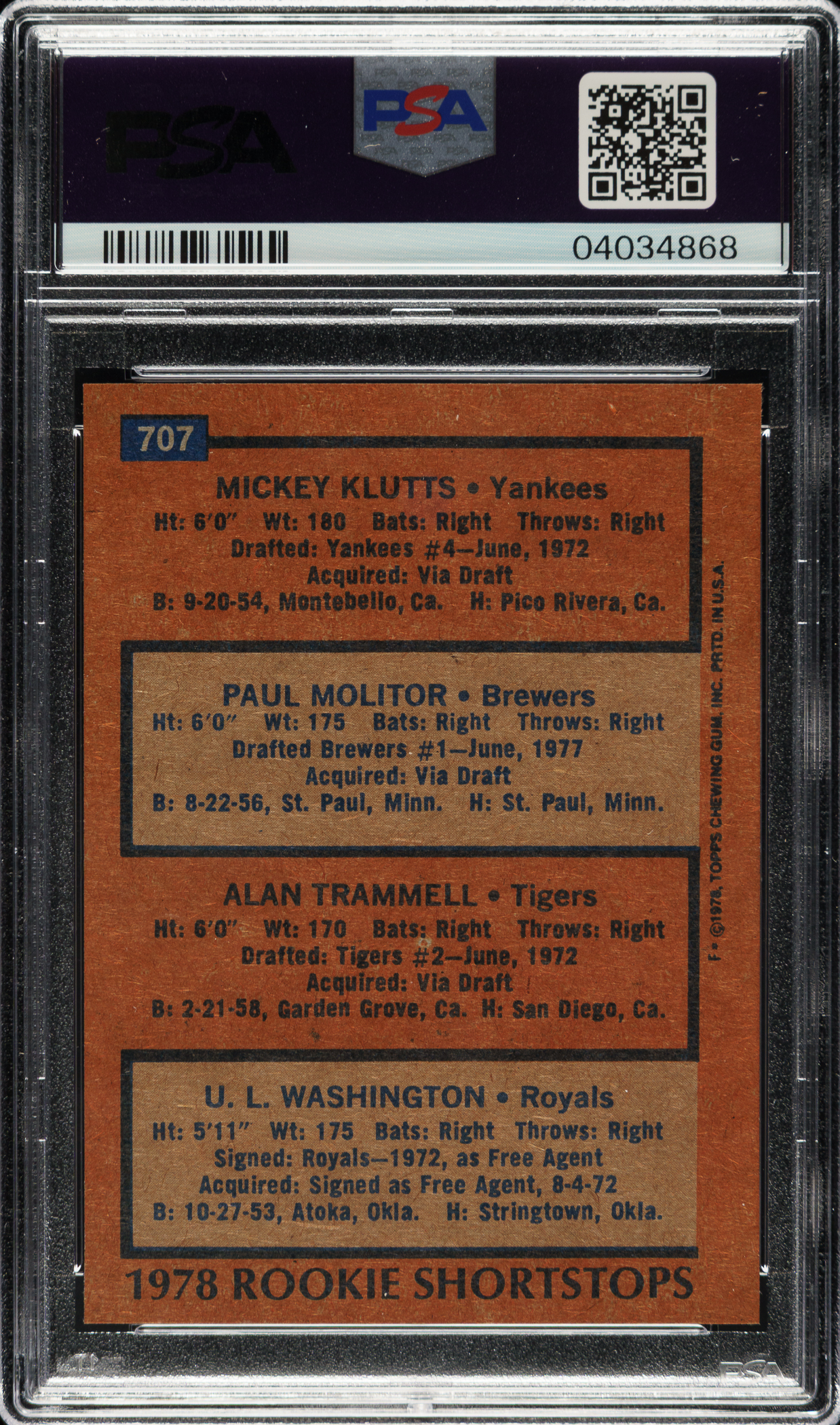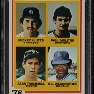 Graded GEM MINT 10 by PSA. Exceptional high-grade example of Hall of Famers Paul Molitor and Alan Trammell's rookie card from the 1978 Topps set. Alongside Eddie Murray's rookie card, Molitor and Trammell's rookie card is the key to the 1978 Topps set. This is simply an incredible card and is without question one of the finest examples we have ever seen or offered at auction. This card boasts four sharp corners, bold colors, a crisp image, and outstanding centering. Flawless reverse. A stunning example worthy of any world-class 1978 Topps set or Hall of Fame rookie card collection.