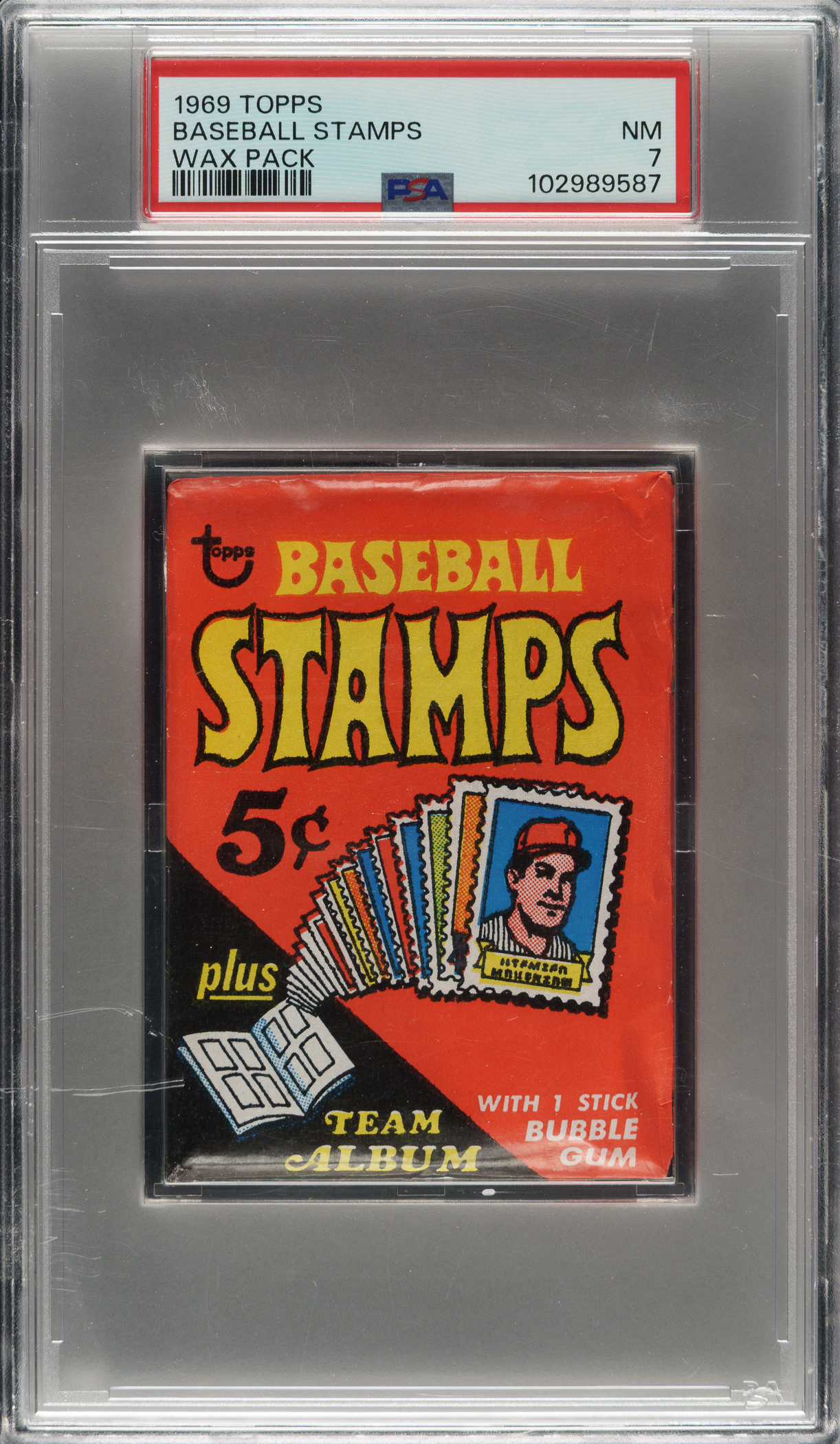 Lot # 2643: 1969 Topps "Baseball Stamps" Unopened Wax Pack PSA NM 7