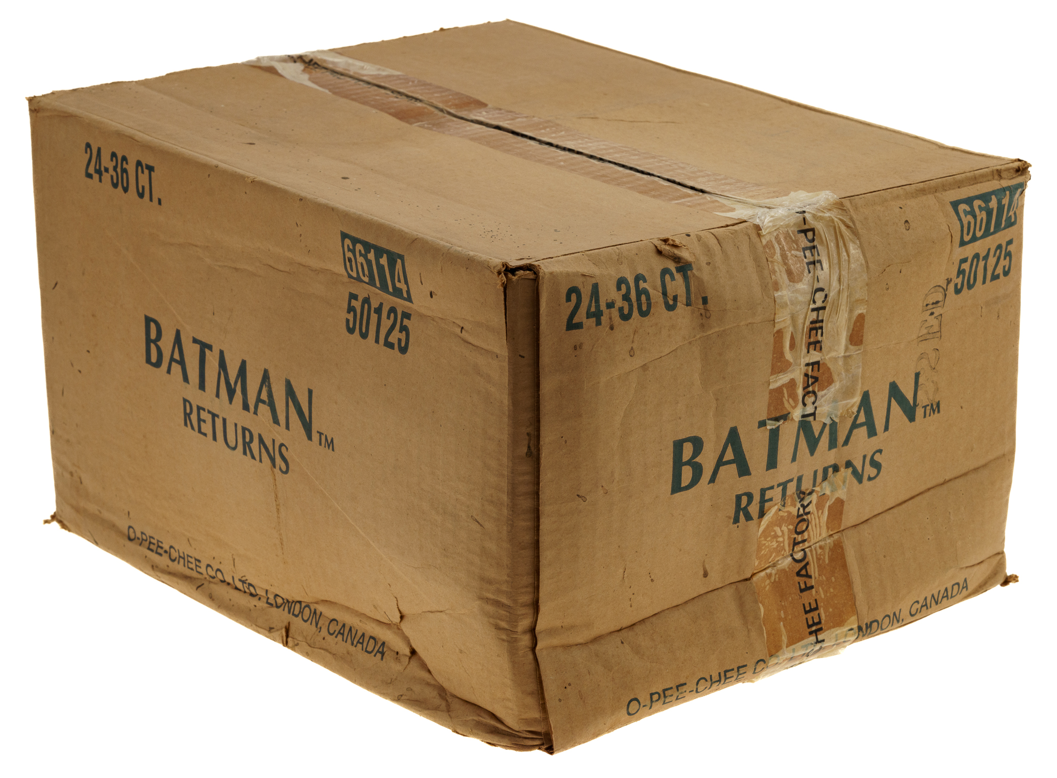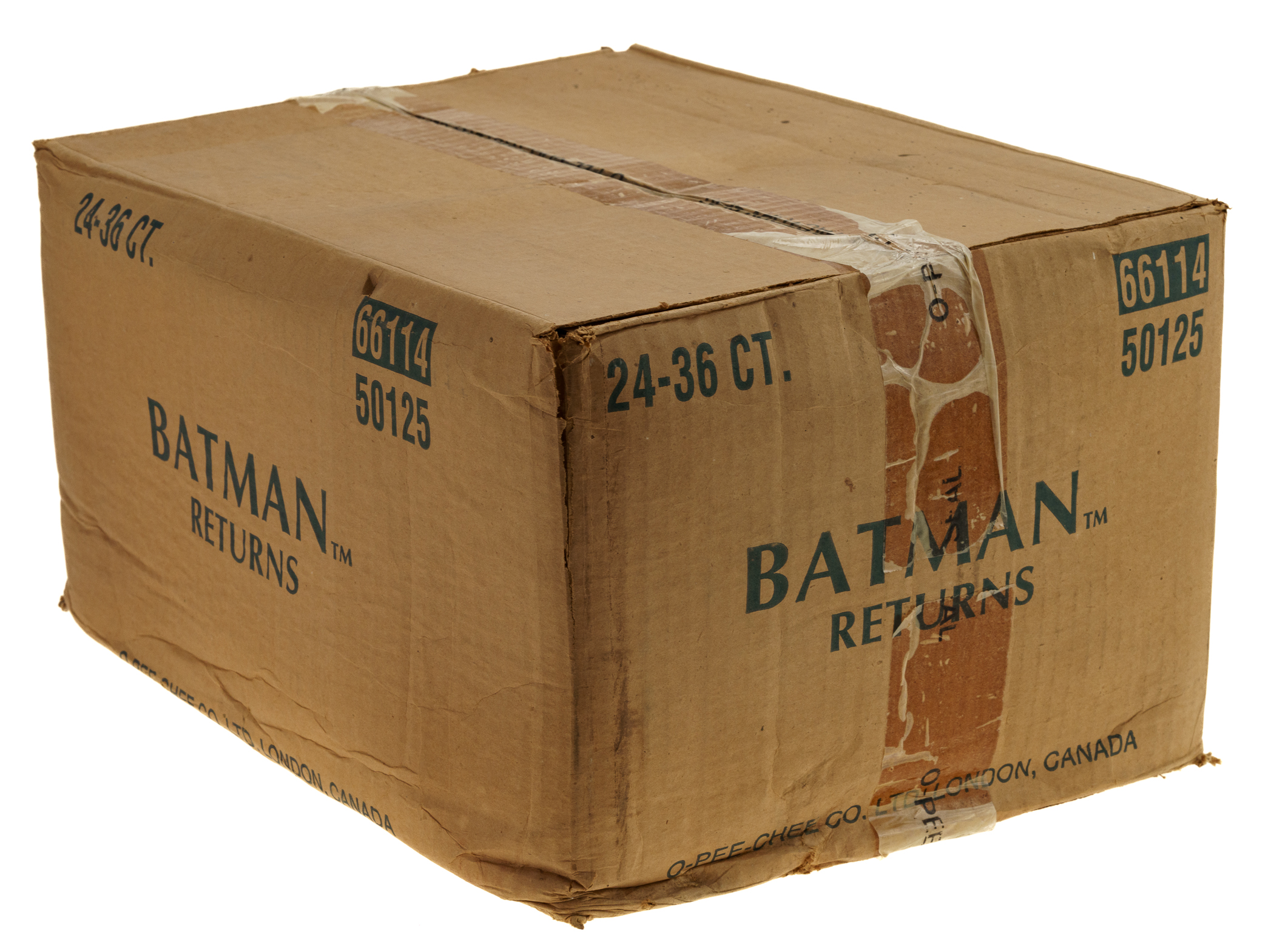 Complete, original factory-sealed wax case of 1992 O-Pee-Chee "Batman Returns" containing 24 boxes with 36 packs per box for a total of 864 packs. With each pack containing six cards, the case represents a total of 5,184 cards. Original factory seals intact with heavy outer box wear. The size/weight of this item requires that there will be an additional shipping charge for this lot.