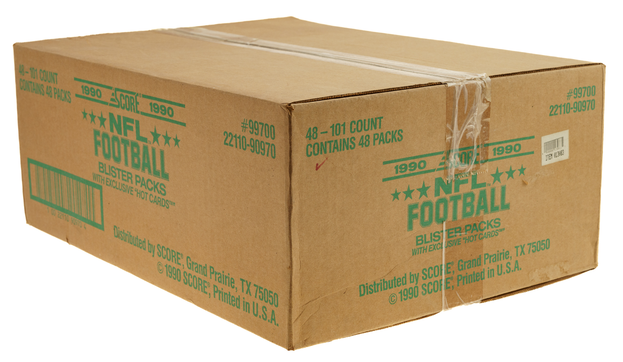Complete, original factory-sealed blister pack case of 1990 Score football containing 48 packs. With each pack containing 101 cards, the case represents a total of 4,848 cards. Original factory seals intact with moderate outer box wear. The size/weight of this item requires that there will be an additional shipping charge for this lot.